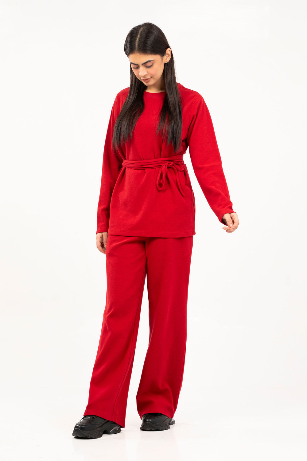 Wide leg trousers in waffle fabrication, featuring drawcorded waist belt and pockets