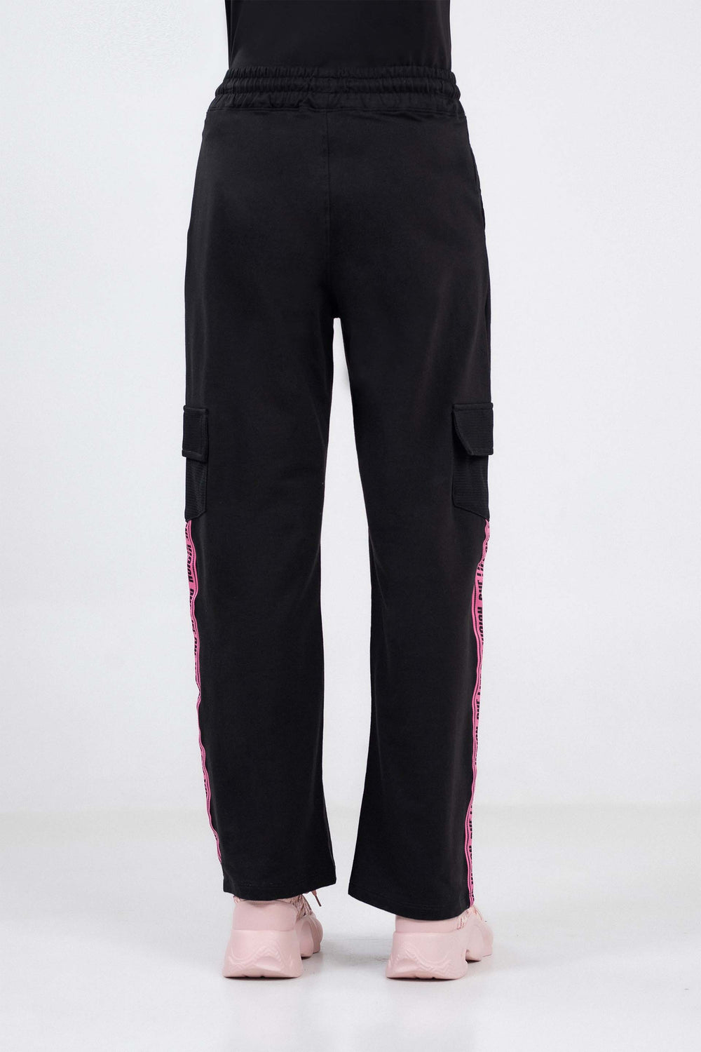 Wide leg cargo style trousers in terry fabrication, featuring elasticated waist belt with drawcord, side pockets in mesh fabrication and tape detailing below cargo pockets