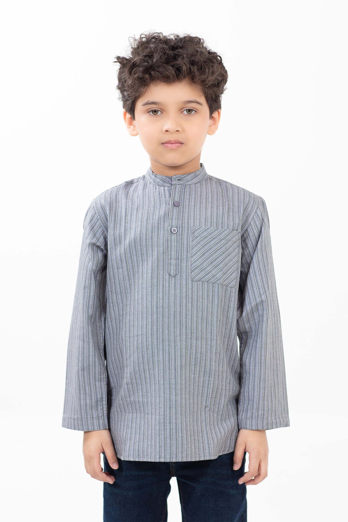 Tunic shirt in stripe fabrication, featuring ban collar and half buttoned placket in front