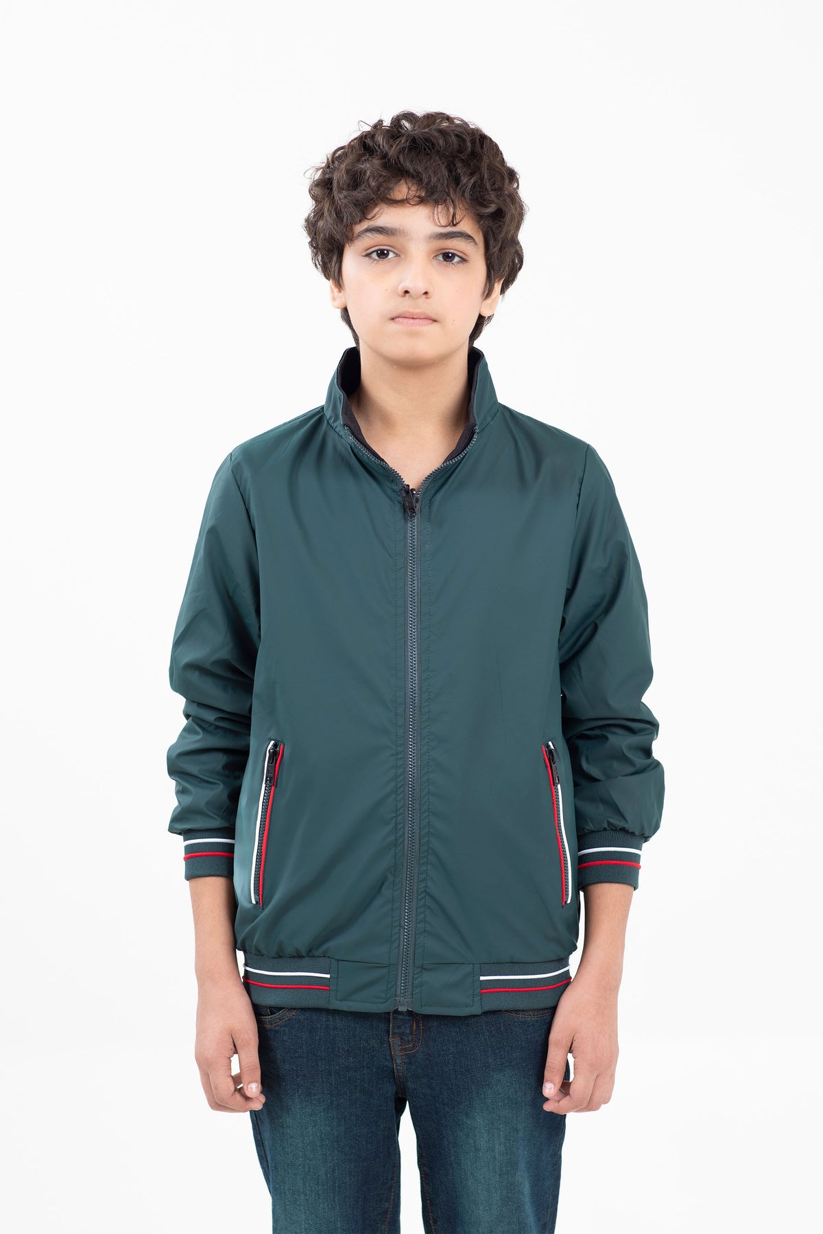 2-sided convertible jacket in polyester fabrication, featuring mock neck and full front zip opening