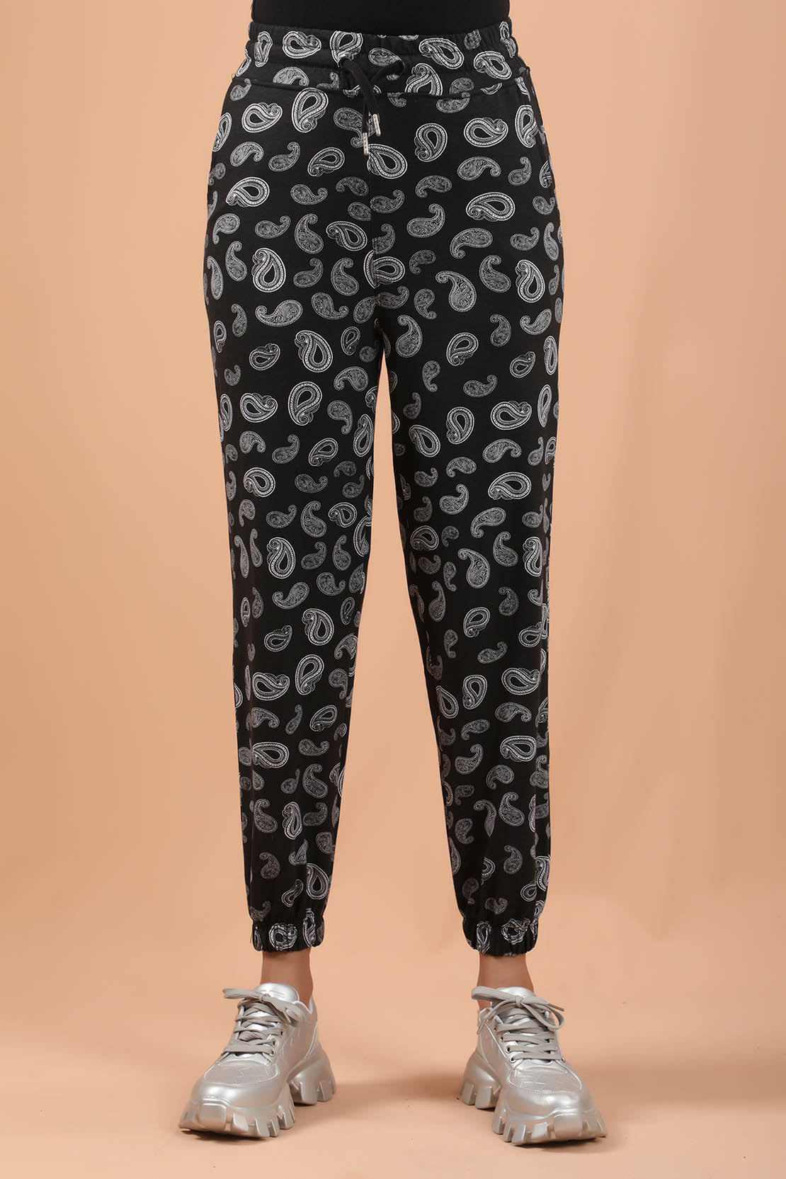 Ribbed edge track pants, featuring drawcorded elastic waist band, pockets and an over all paisley print