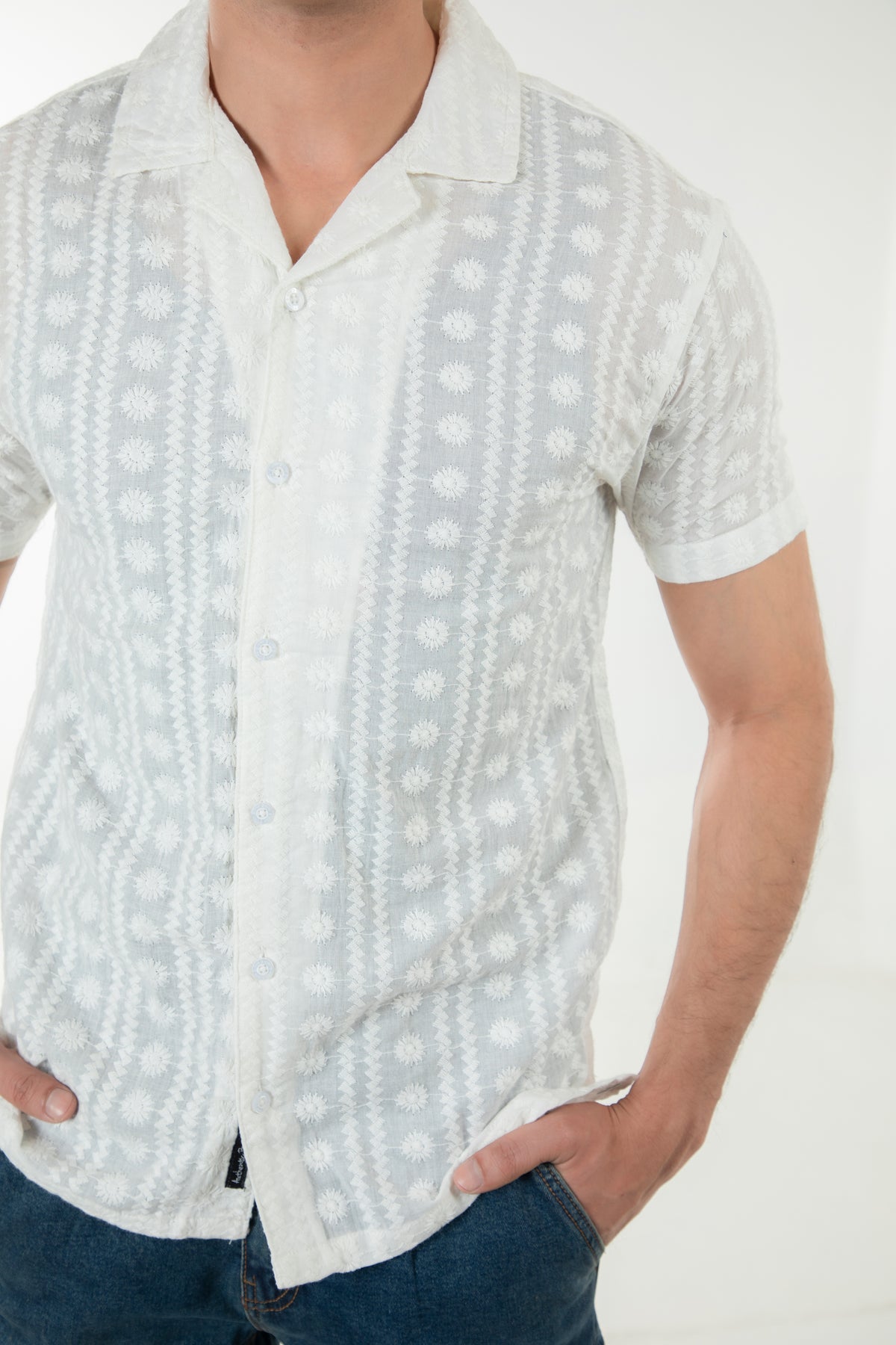 Relax fit shirt in embroidered cotton fabrication, featuring cuban collar with front buttoned placket