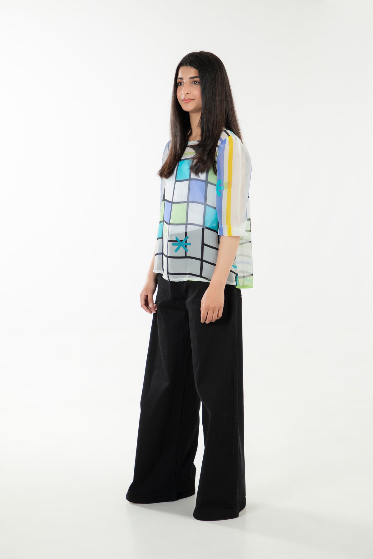 A-line tunic top in printed chiffon blend fabrication, featuring round neck and volumnous sleeves with elasticated edging