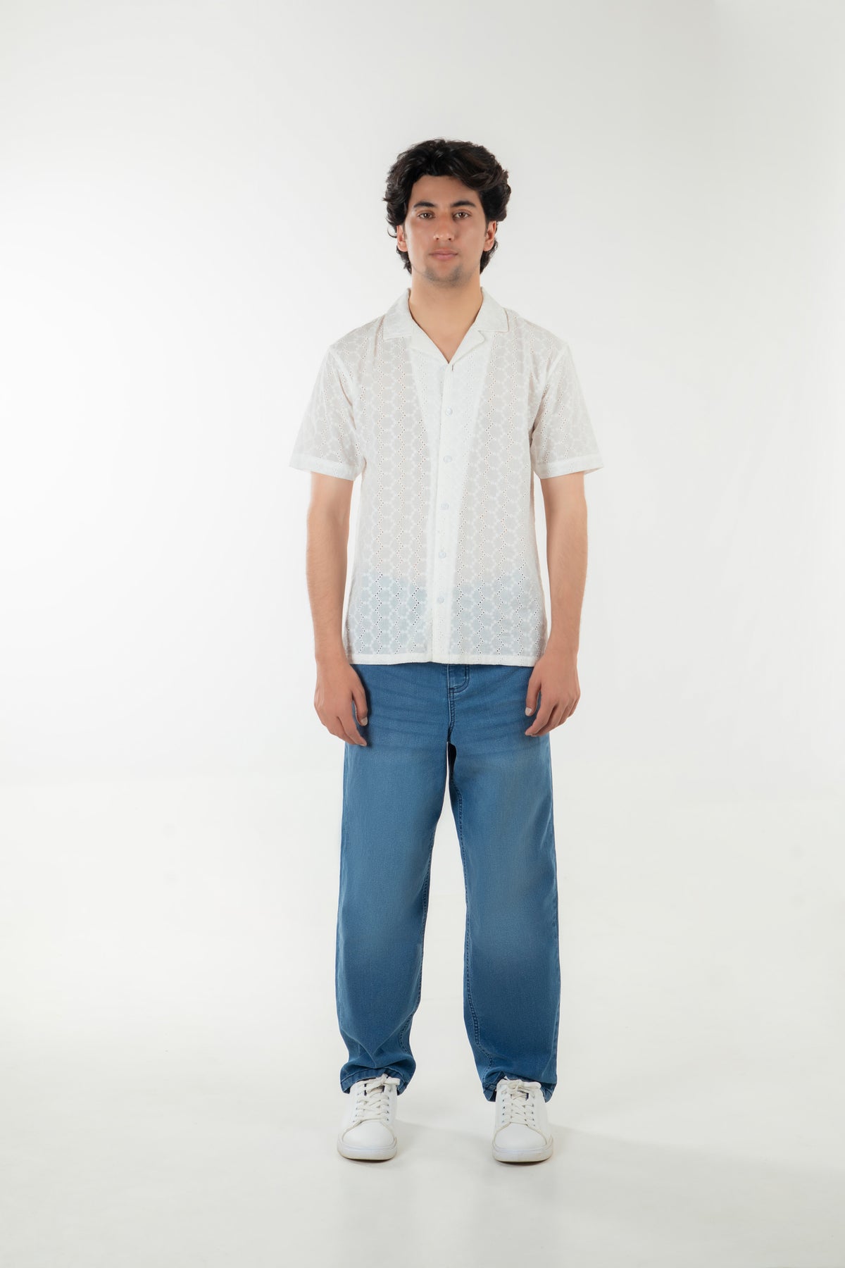 Relax fit shirt in embroidered cotton fabrication, featuring cuban collar with front buttoned placket