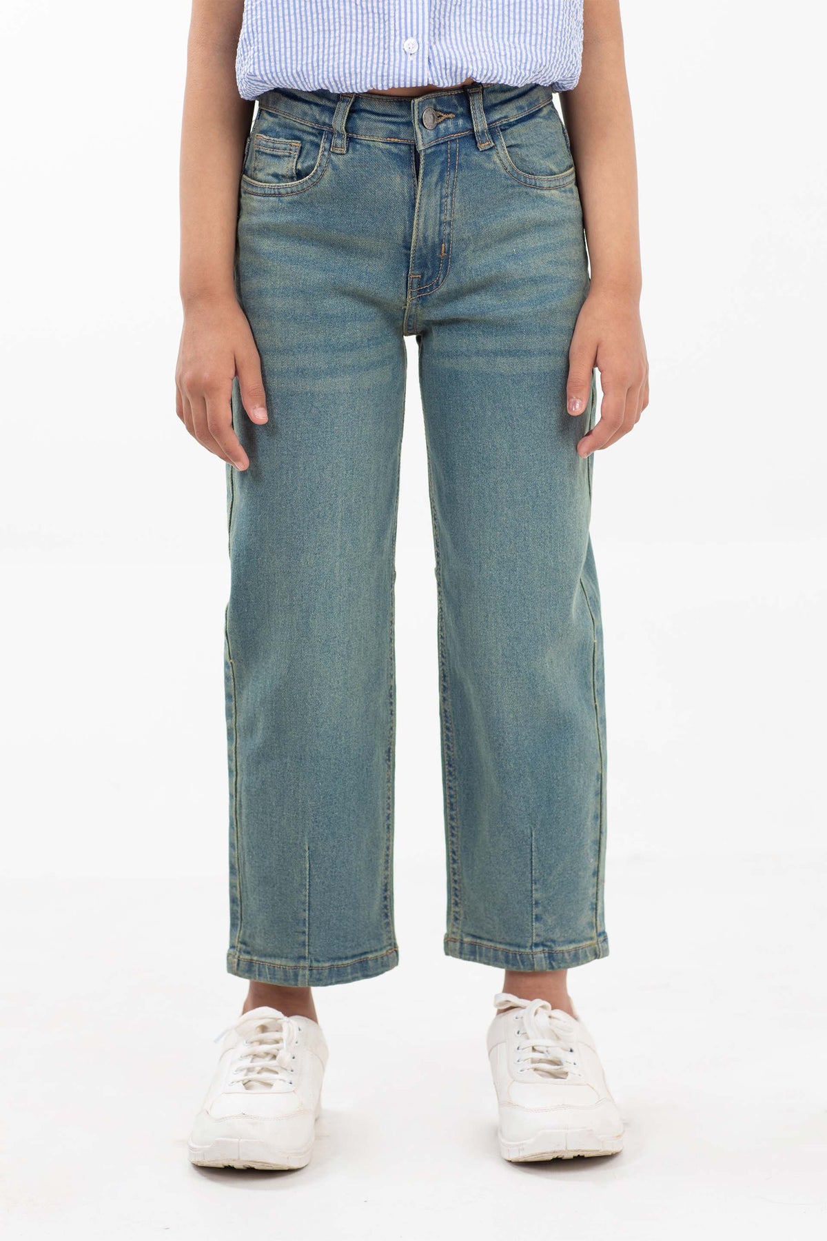 Wide leg denim jeans, featuring side pockets and elasticated waist belt with drawcord