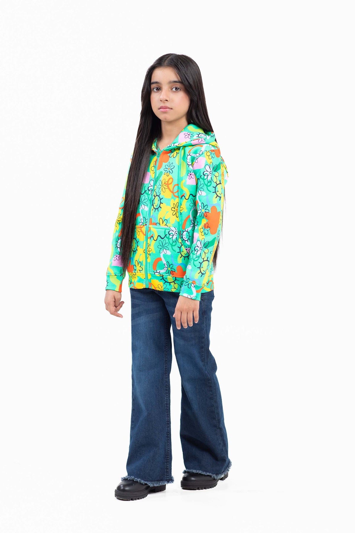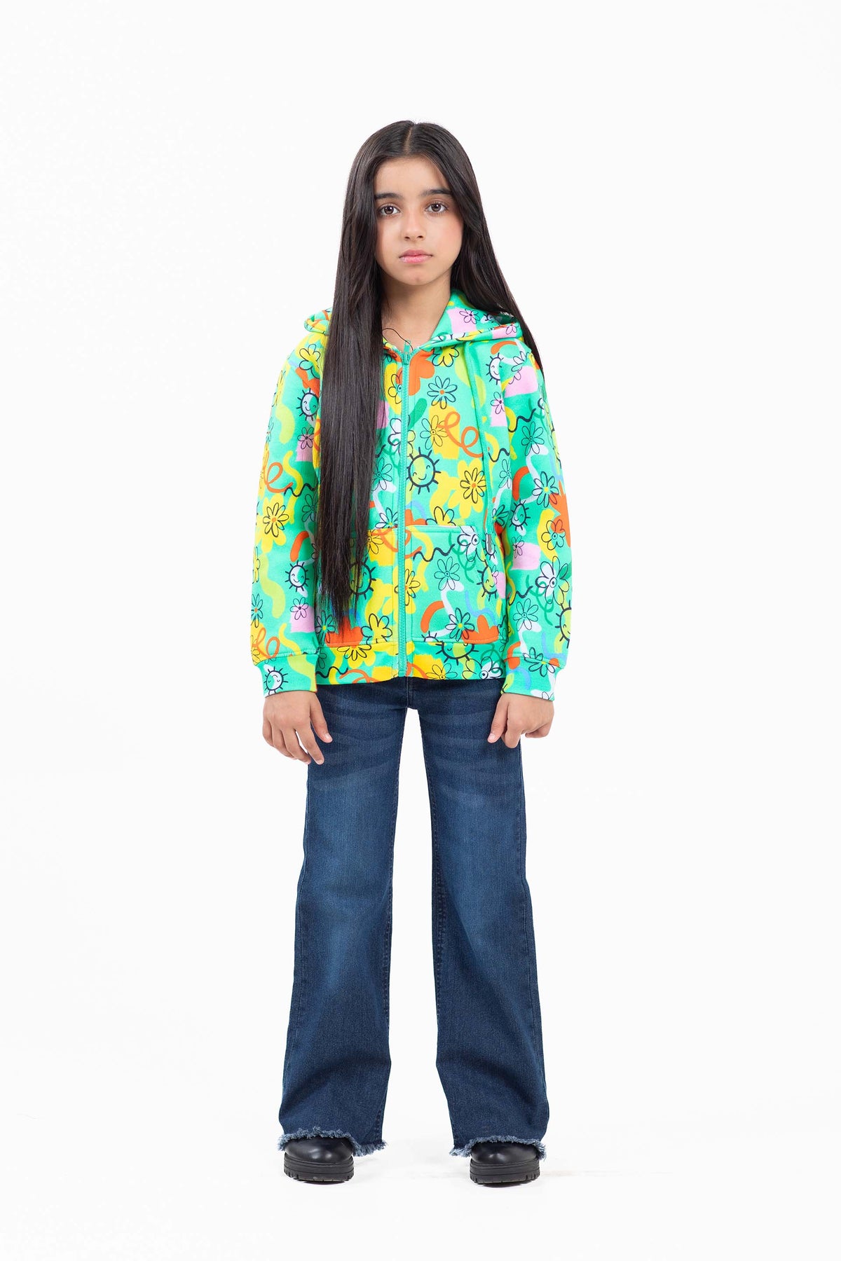 Zipper hoodie in printed fleece fabrication, featuring drawcorded hood and kangroo pocket in front