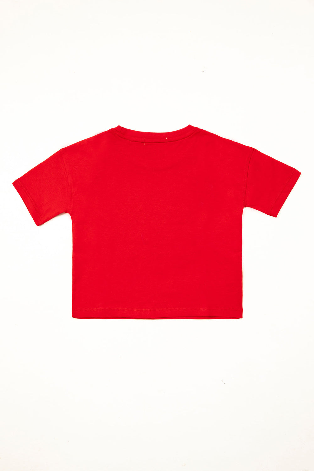 Drop shoulder tee shirt in jersey fabrication, featuring round neck and rhinestone embellishment in front