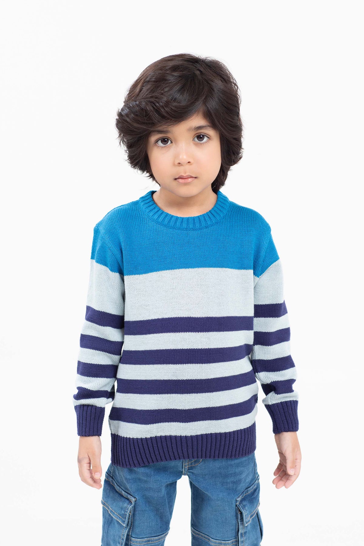 Crew neck sweater in blended material, featuring colour blocking and stripe pattern