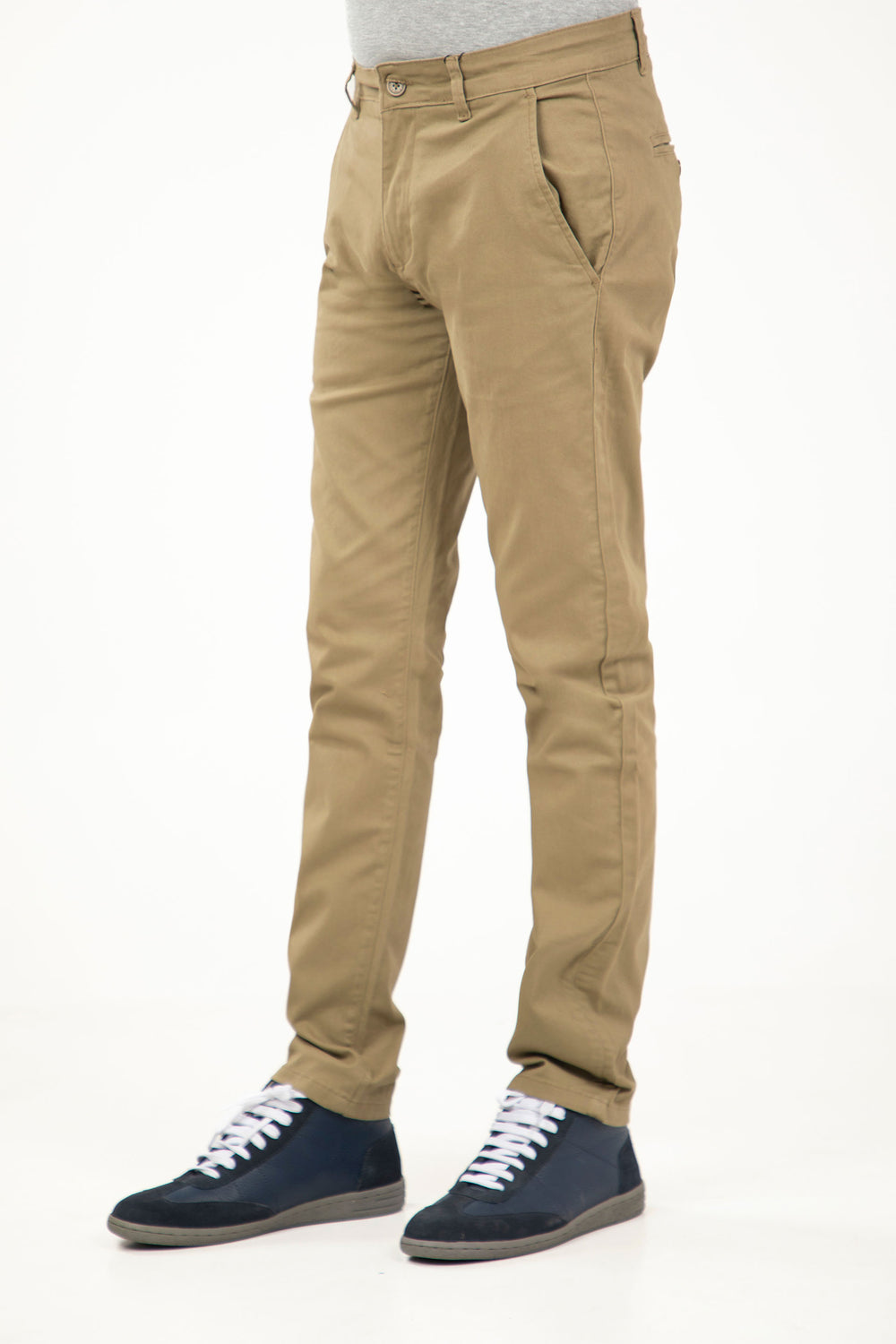 Basic slim fit chinos in twill fabrication, featuring front fly opening and side cross pockets