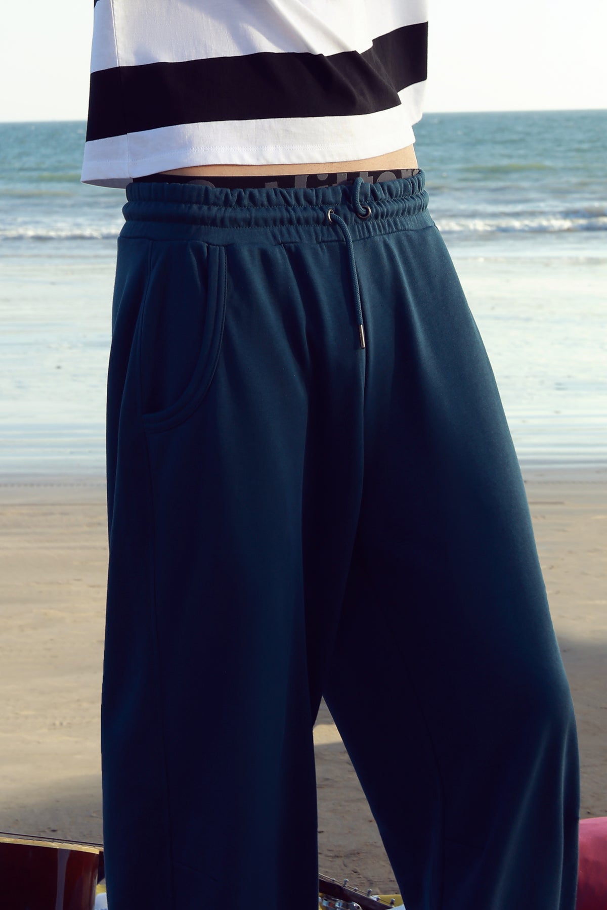 Basic baggy track pants in terry fabrication, featuring drawcorded waist belt, side pockets and elasticated hem