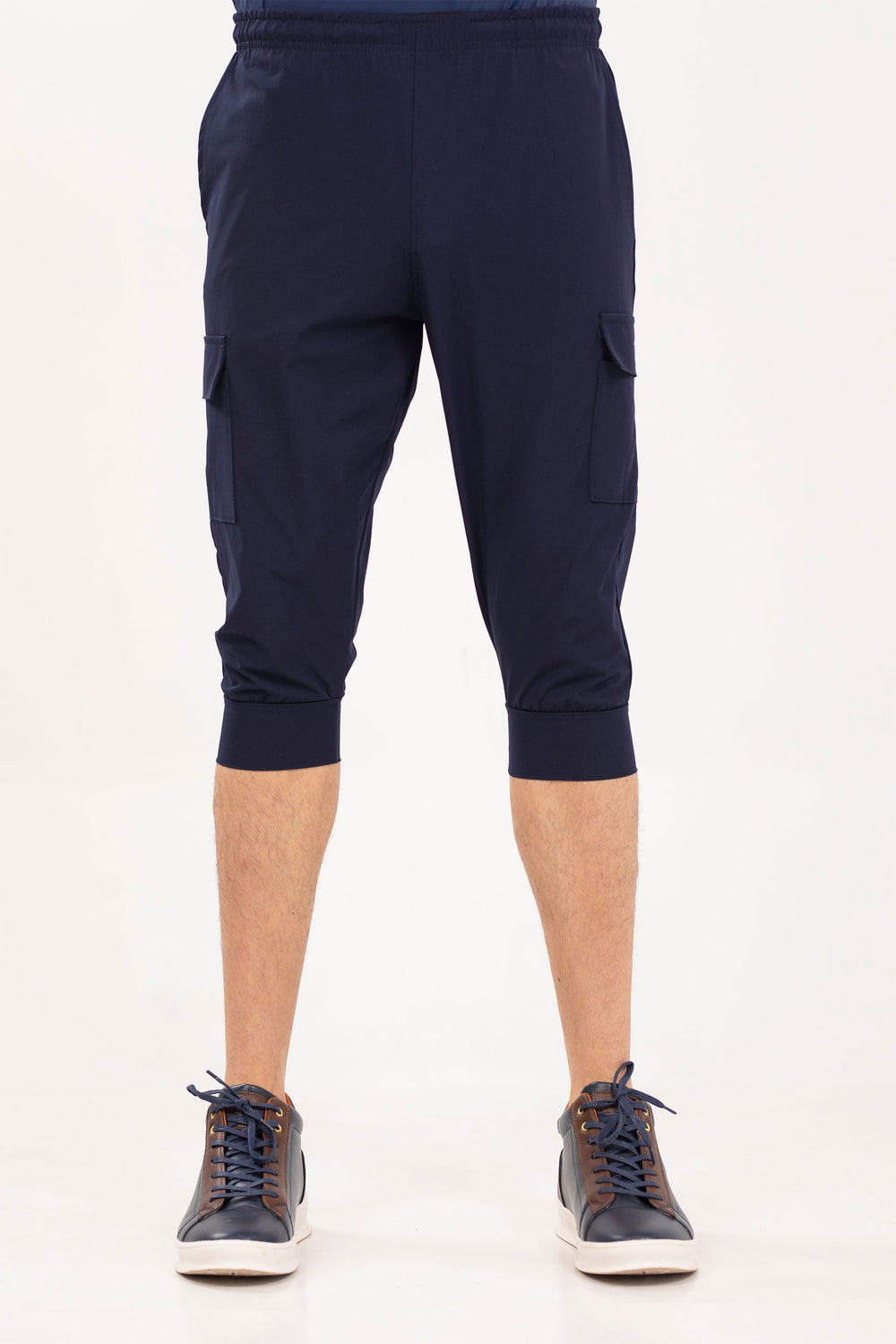 3-quarter gym pants in dry fit fabrication, featuring elasticate waist belt with drawcord and cargo pocket on sides