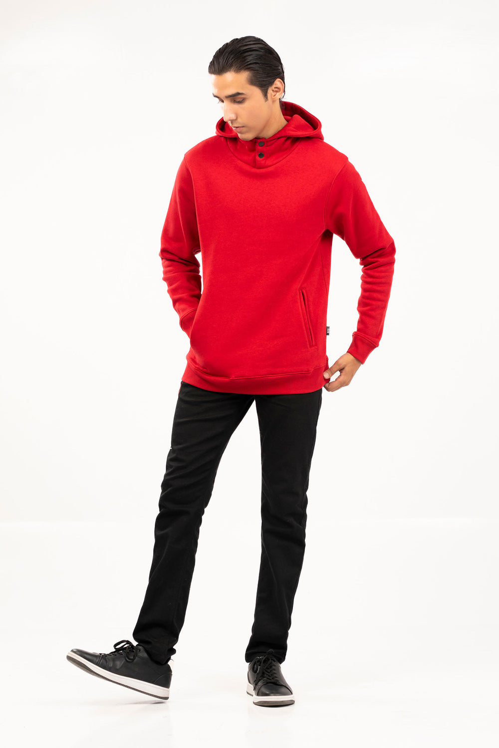 Basic fleece hoodie, featuring buttoned up hood, front pockets and ribbed hem