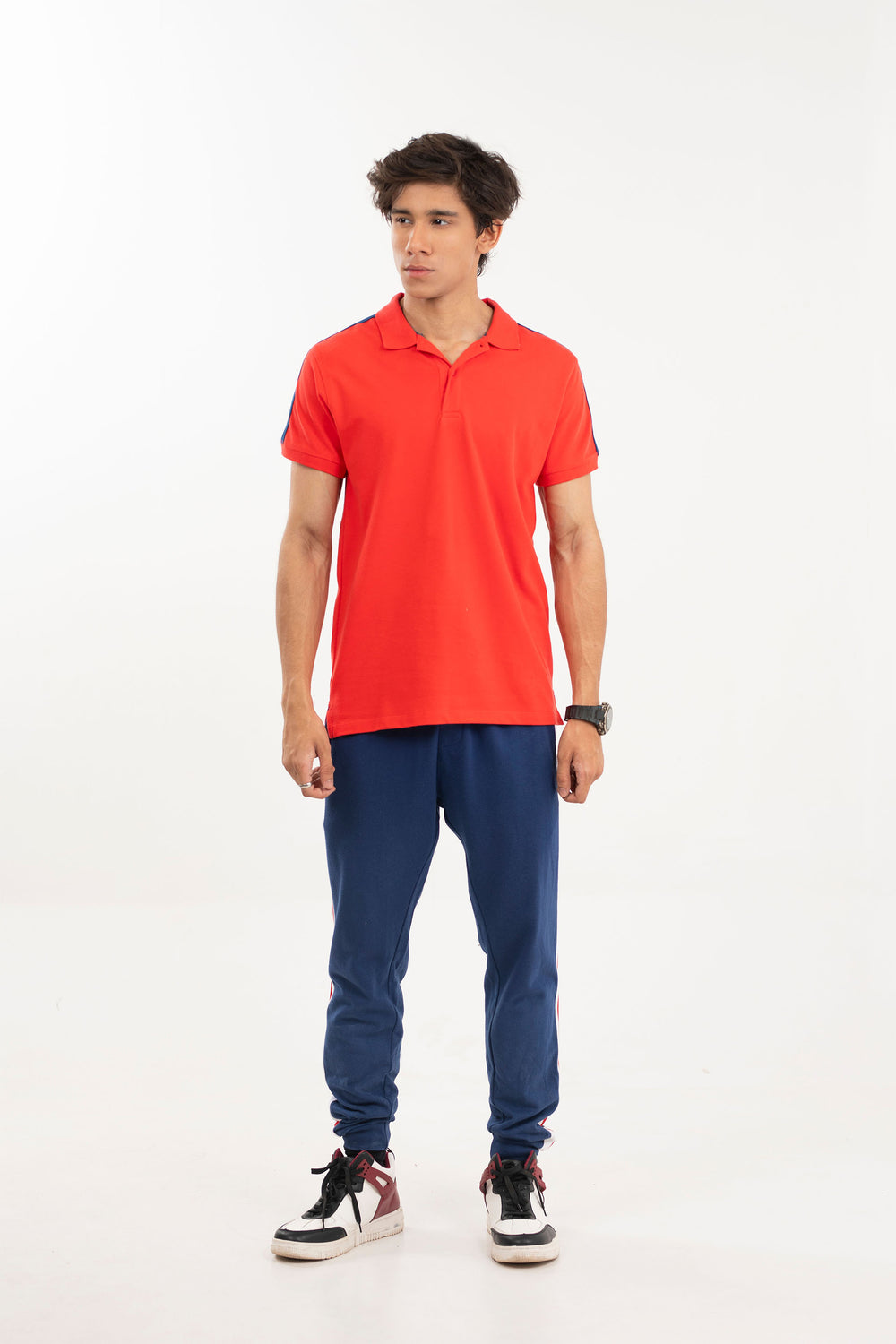 Pique polo, featuring front buttoned placket with collar with tape detailing on sleeves and shoulder