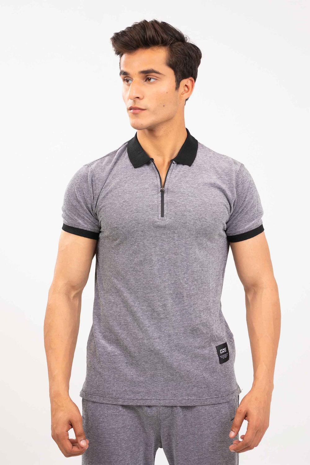 Basic polo in bird-eye pique fabrication, featuring front zip placket with collar