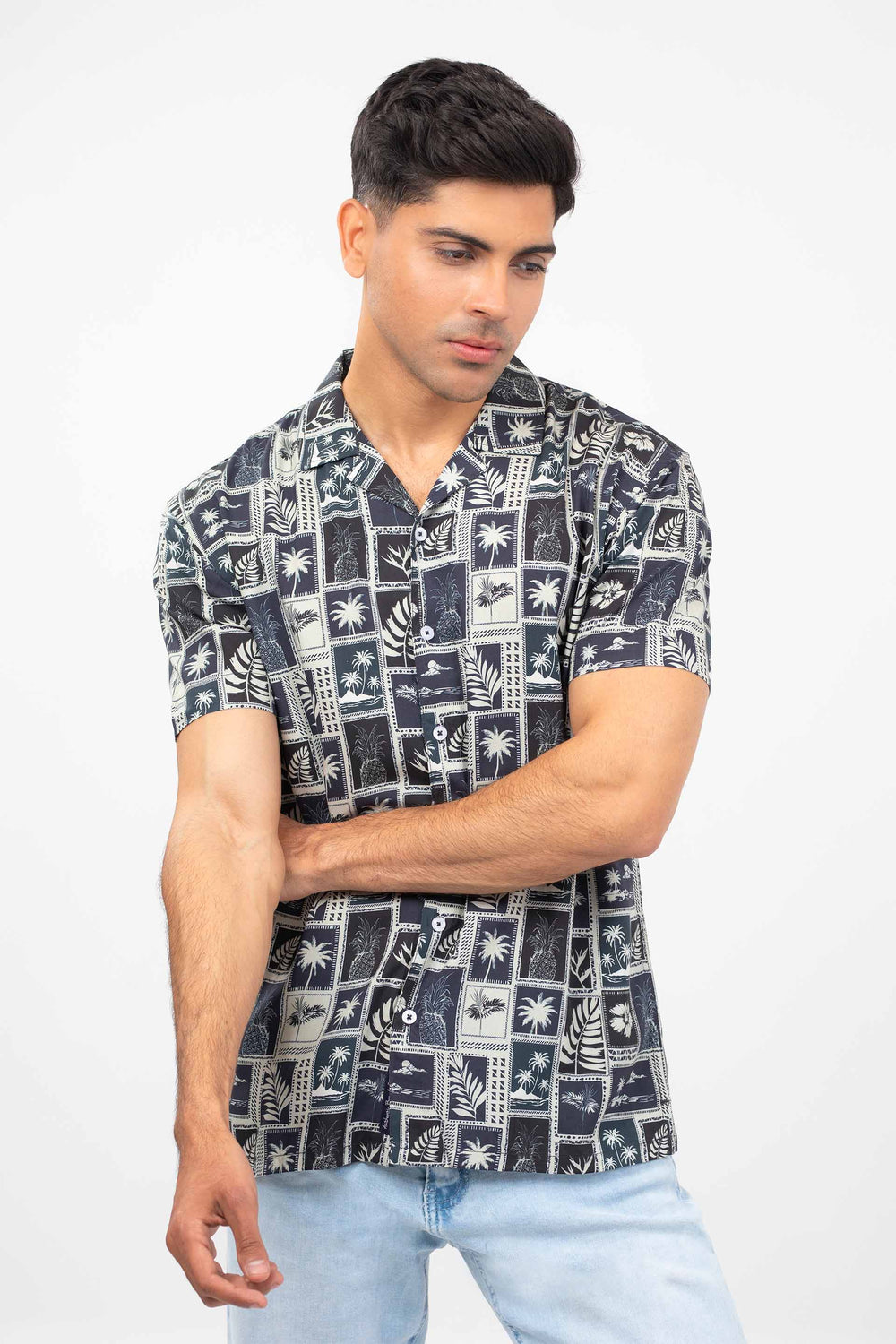 Men Hawaiian shirt in printed fabric, featuring front buttoned placket with Cuban collar