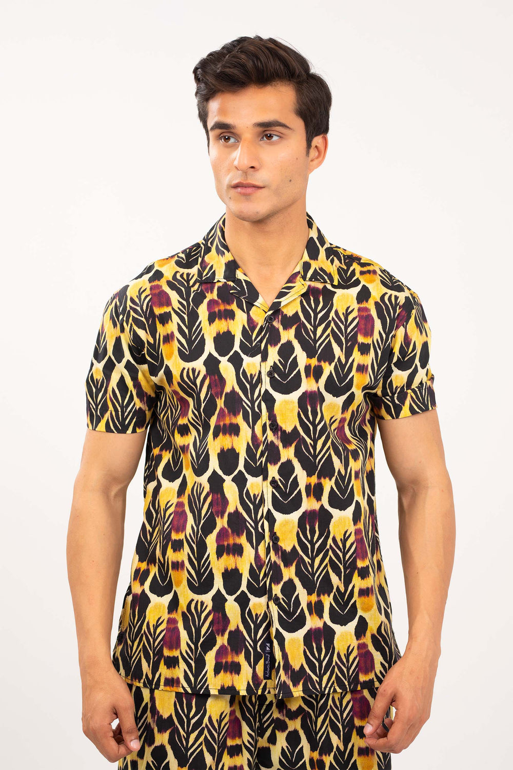 Relax fit shirt in printed fabric, featuring front buttoned placket with Cuban collar