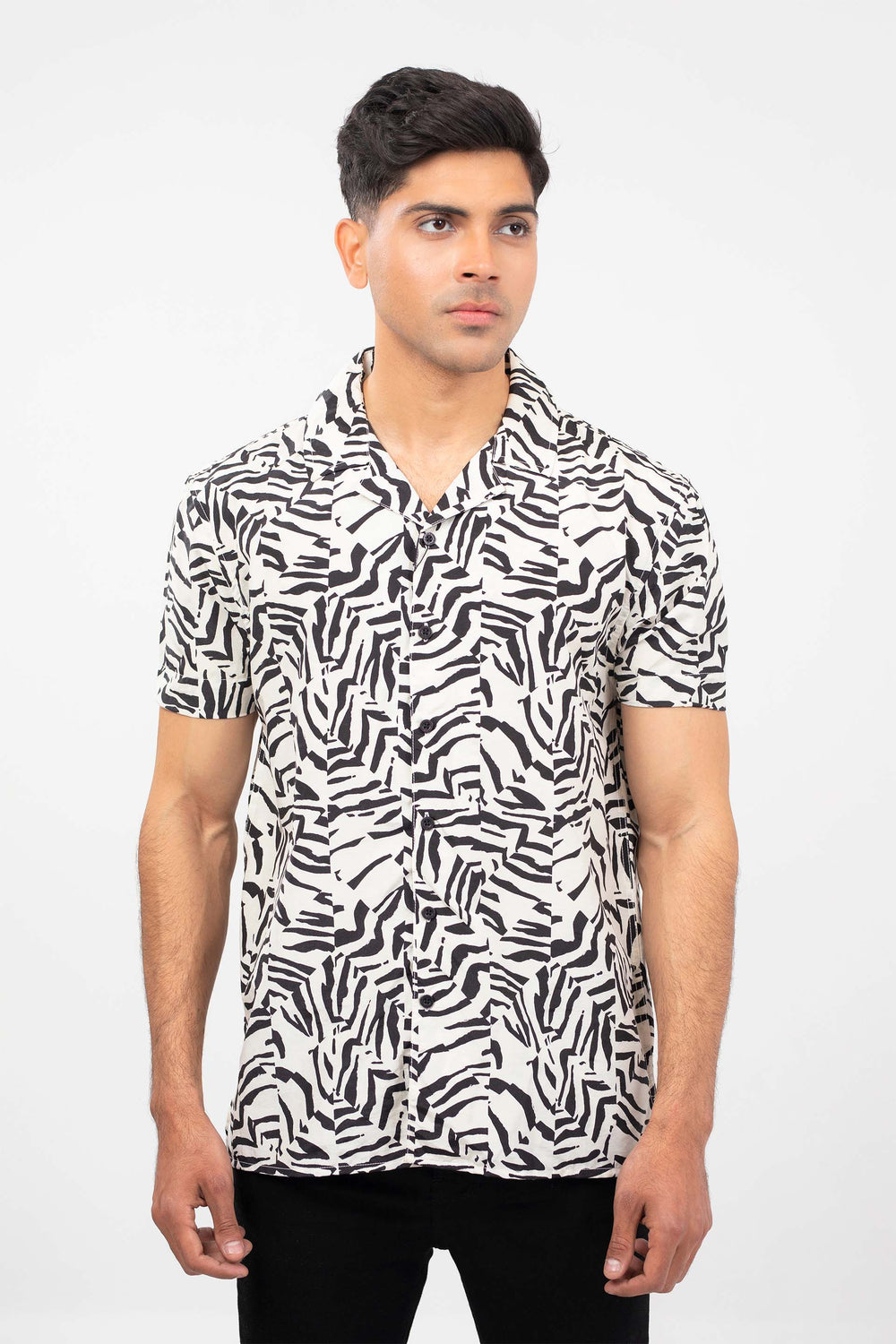Relax fit shirt in printed fabrication, featuring cuban collar with front buttoned placket and a single pocket in front