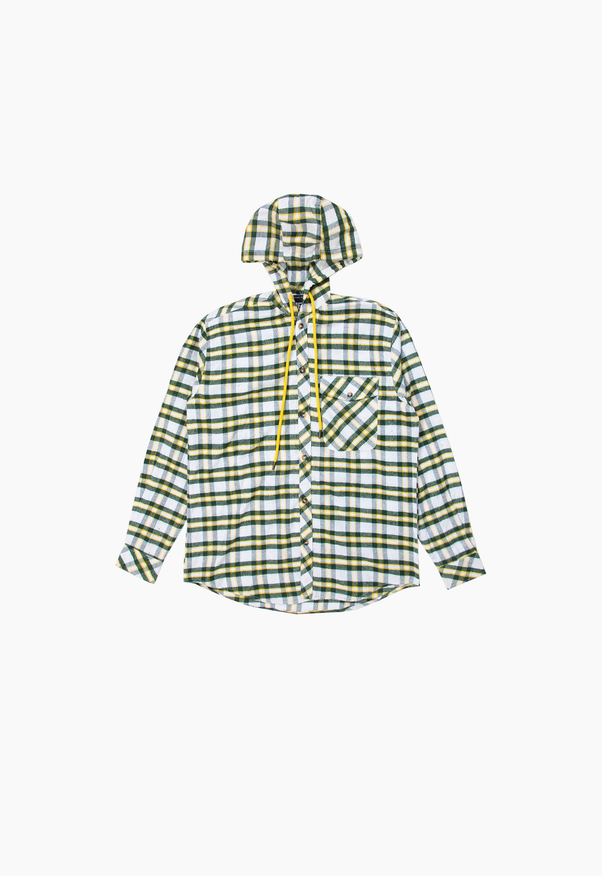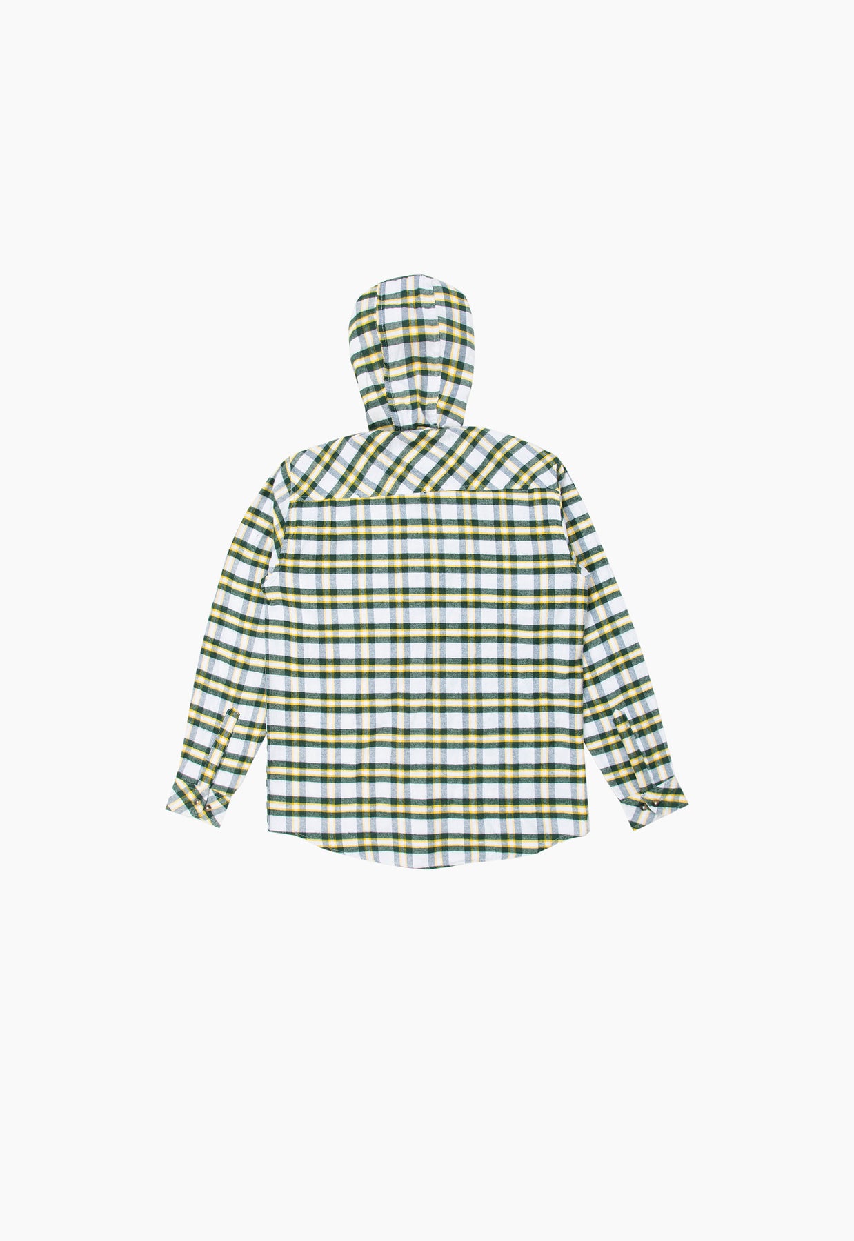 Comfort fit shirt in flannel fabrication, featuring self fabric hood with drawcord, front buttoned placket and single flap pocket in front