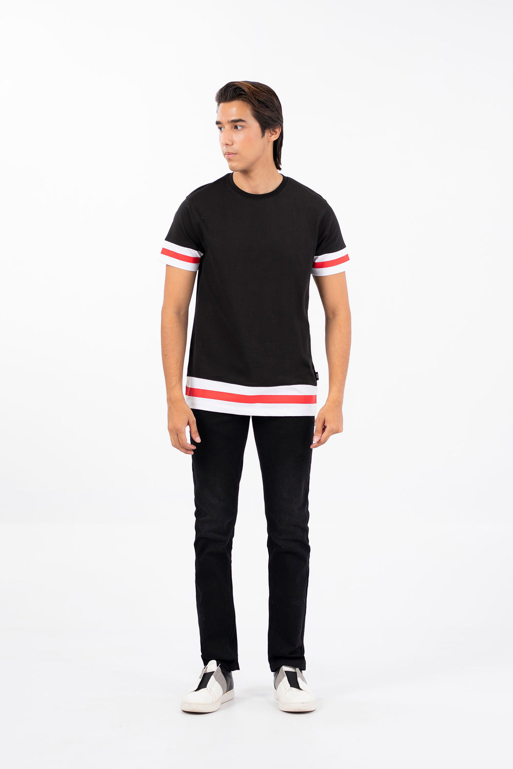 Crew neck tee shirt in cotton jersey, featuring cut & sew panels at bottom and sleeves