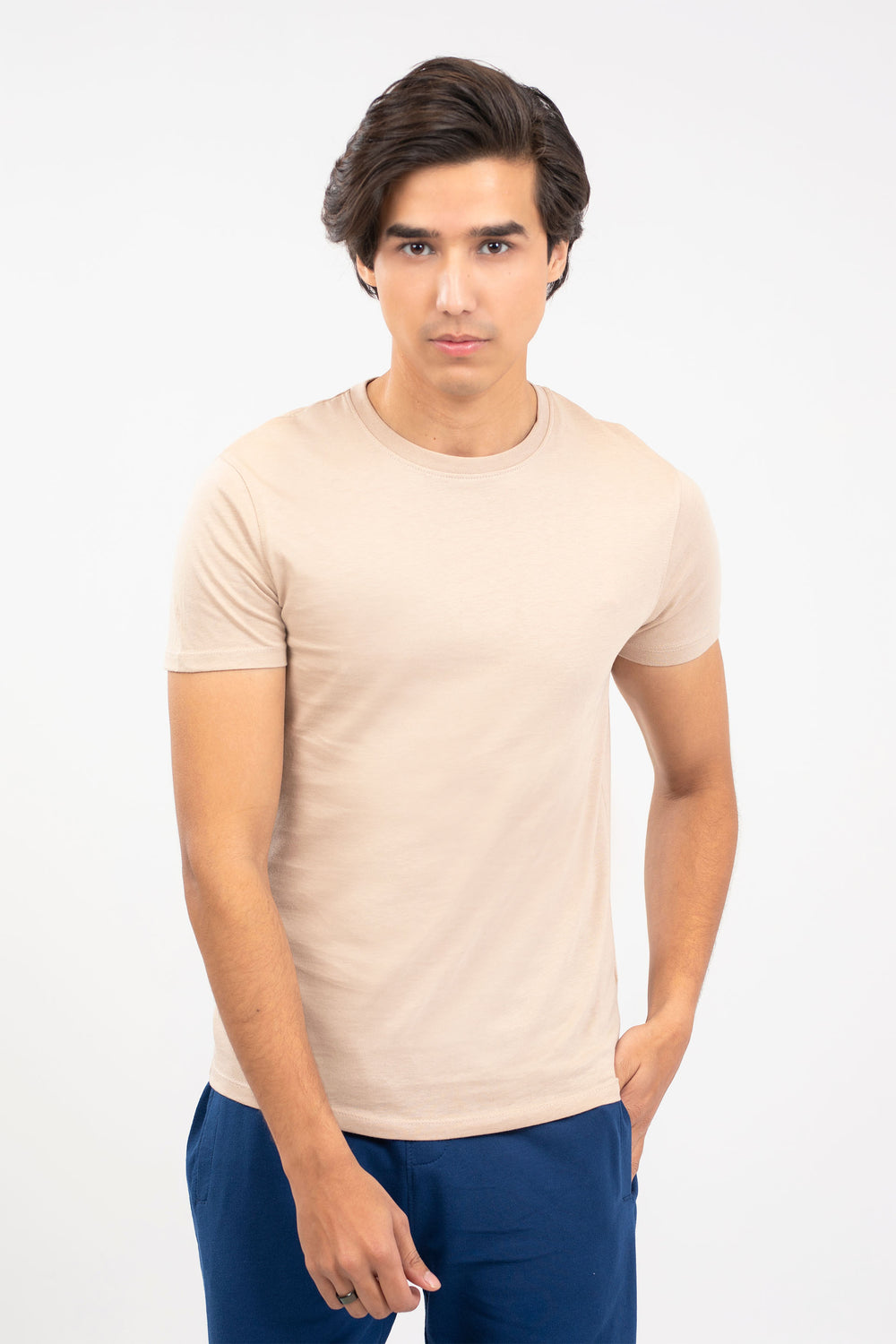 Basic crew neck tee shirt in jersey fabrication, featuring short sleeves