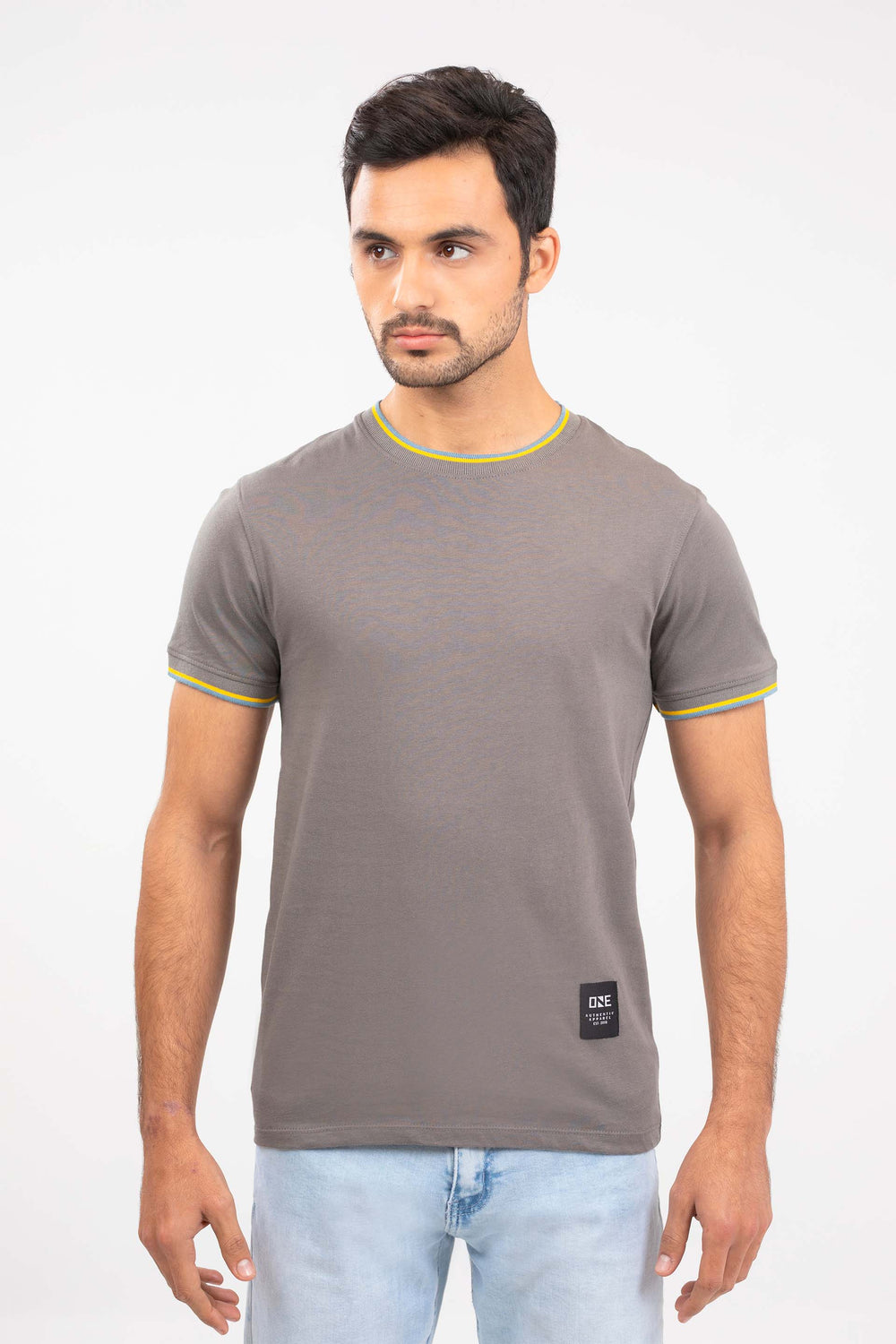 Premium basic crew neck tee shirt in jersey fabrication, featuring short sleeves and rib detailing with tipping