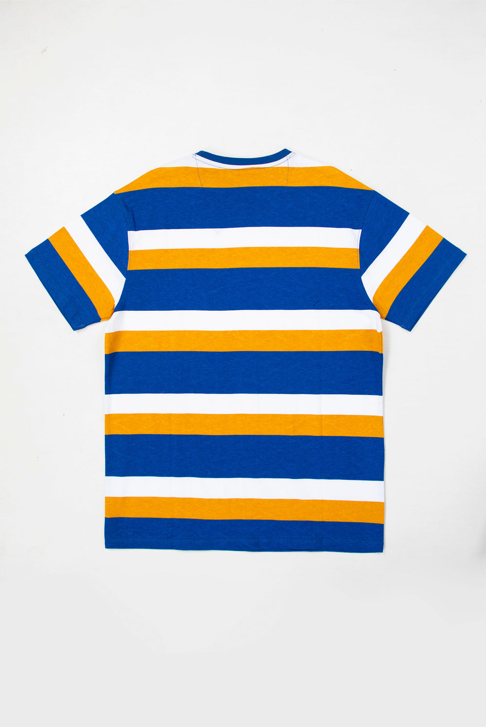Comfort fit tee shirt in striped jersey fabrication, featuring short sleeves and crew neck