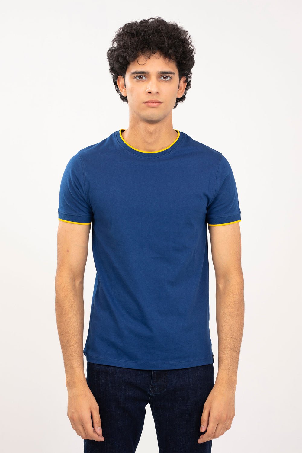 Basic crew neck tee shirt in jersey fabrication, featuring short sleeves with tipping detail at neck & armband