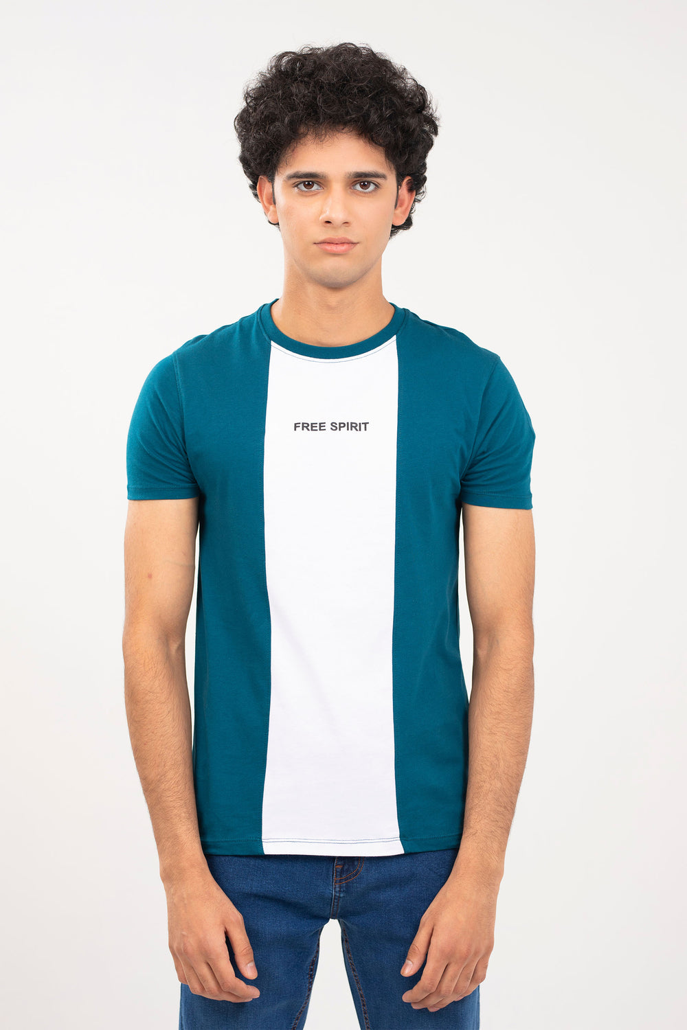 Crew neck tee shirt in jersey fabrication, featuring short sleeves and print in front with contrasting panels