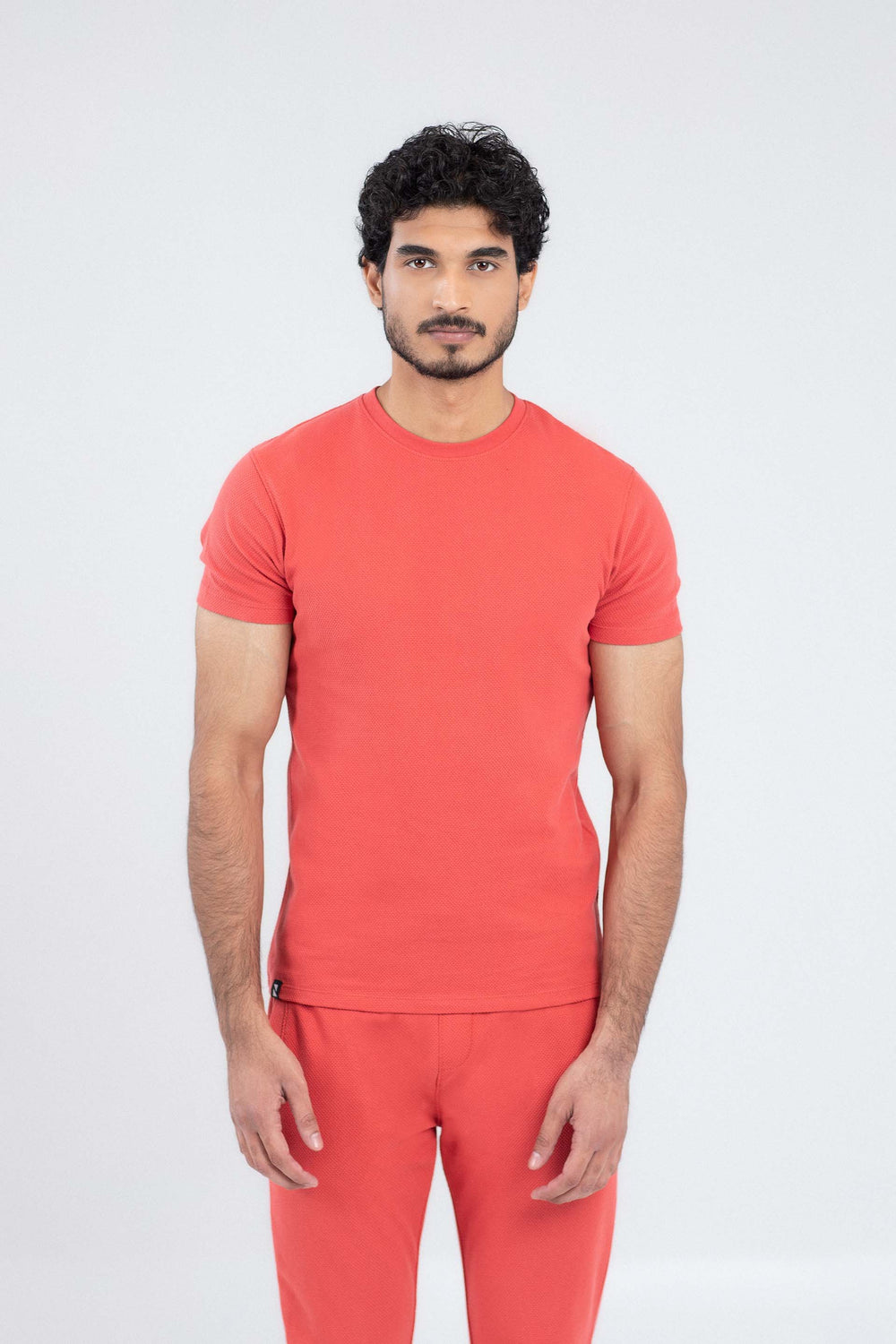 Basic crew neck tee shirt in popcorn fabrication, featuring short sleeves
