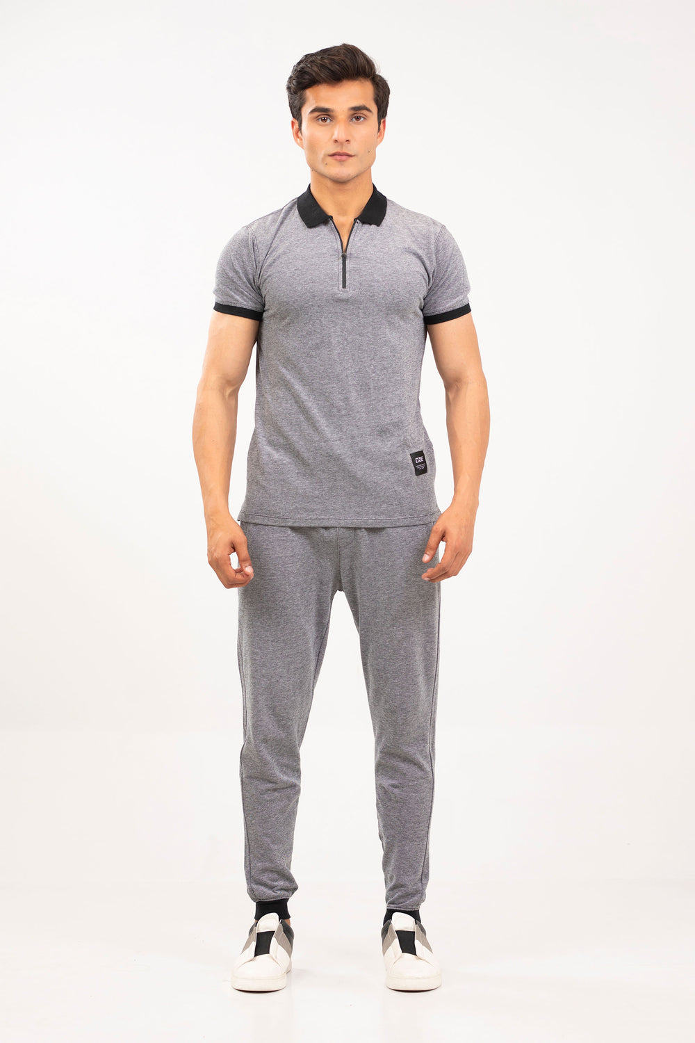 Basic polo in bird-eye pique fabrication, featuring front zip placket with collar