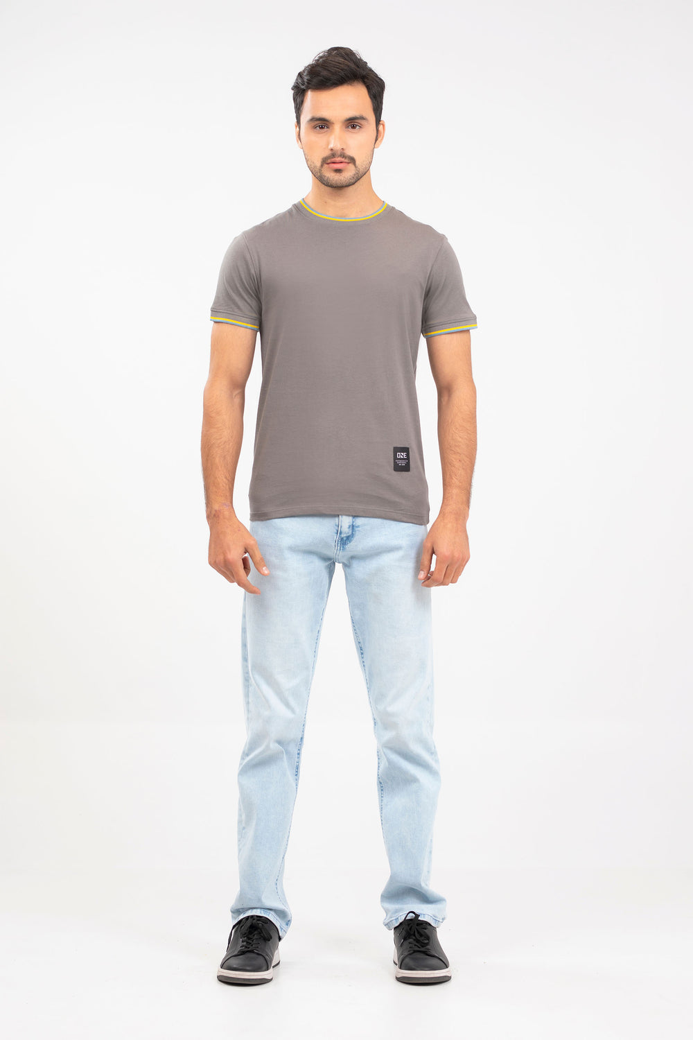 Premium basic crew neck tee shirt in jersey fabrication, featuring short sleeves and rib detailing with tipping