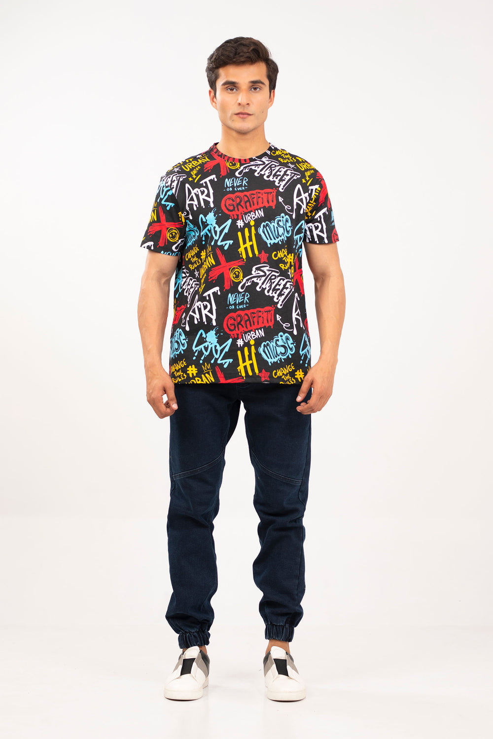 Comfort fit crew neck tee shirt in printed jersey fabrication, featuring short sleeves