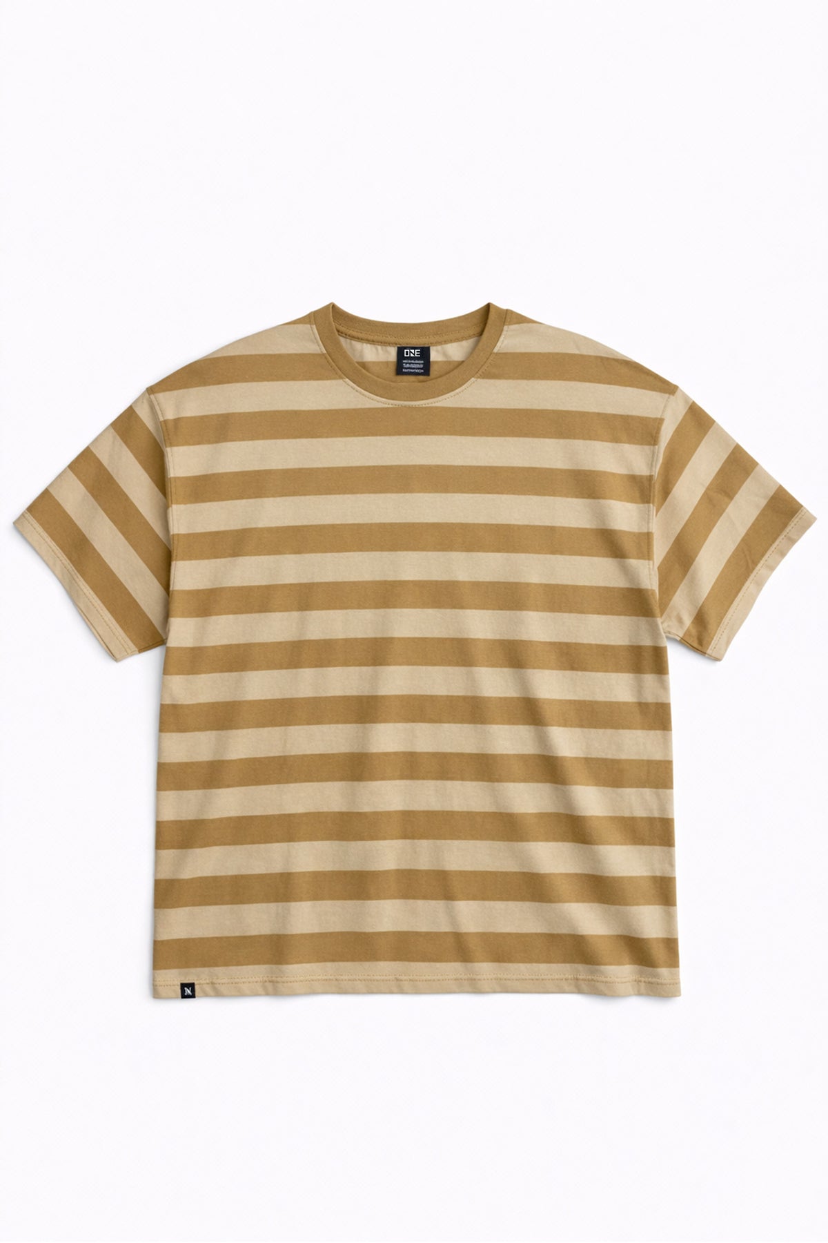 Drop shoulder boxy fit tee in yarn dyed jersey fabrication, featuring crew neck and stripe pattern