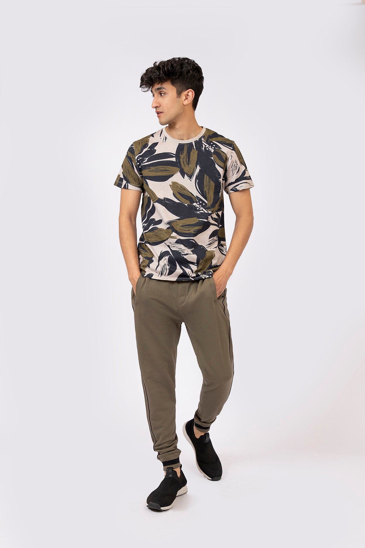 Crew neck tee shirt in jersey fabrication, featuring an over all print