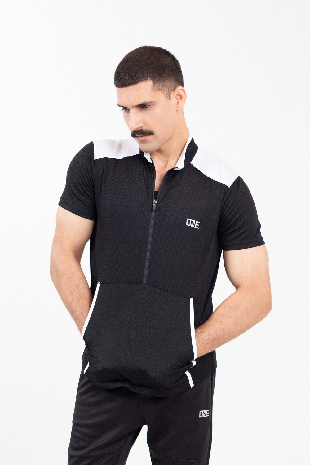 Regular fit gym tee shirt in textured dry fit fabrication, featuring ban collar with and kangroo pocket in front