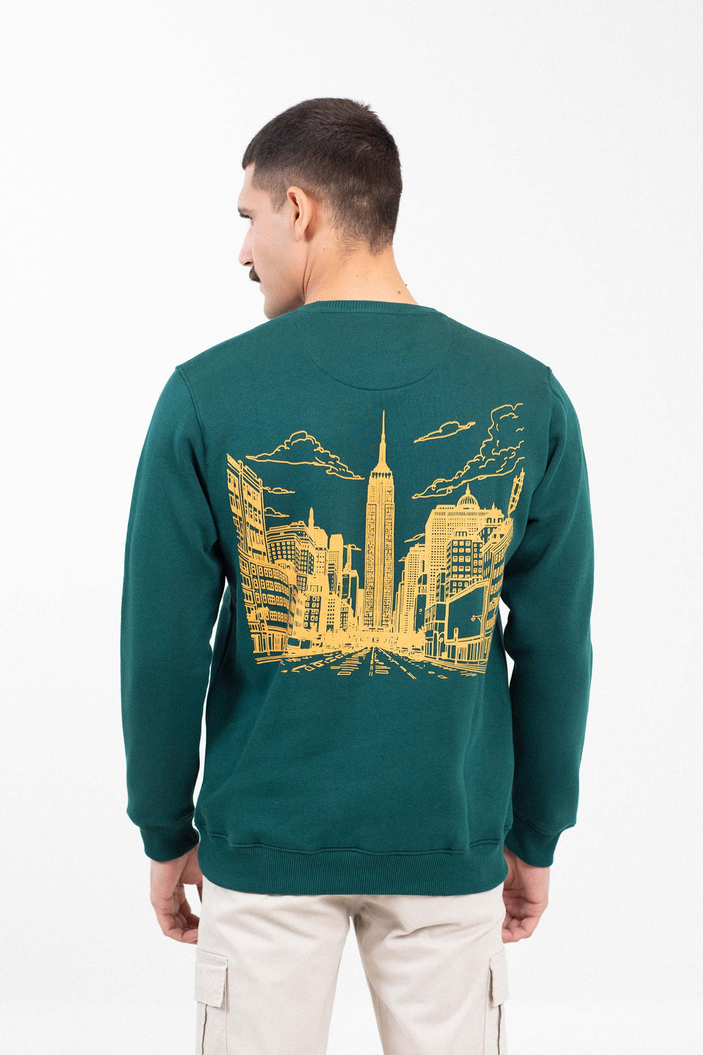 Comfort fit sweatshirt in fleece fabrication, featuring crew neck with embroidery in front and print at back
