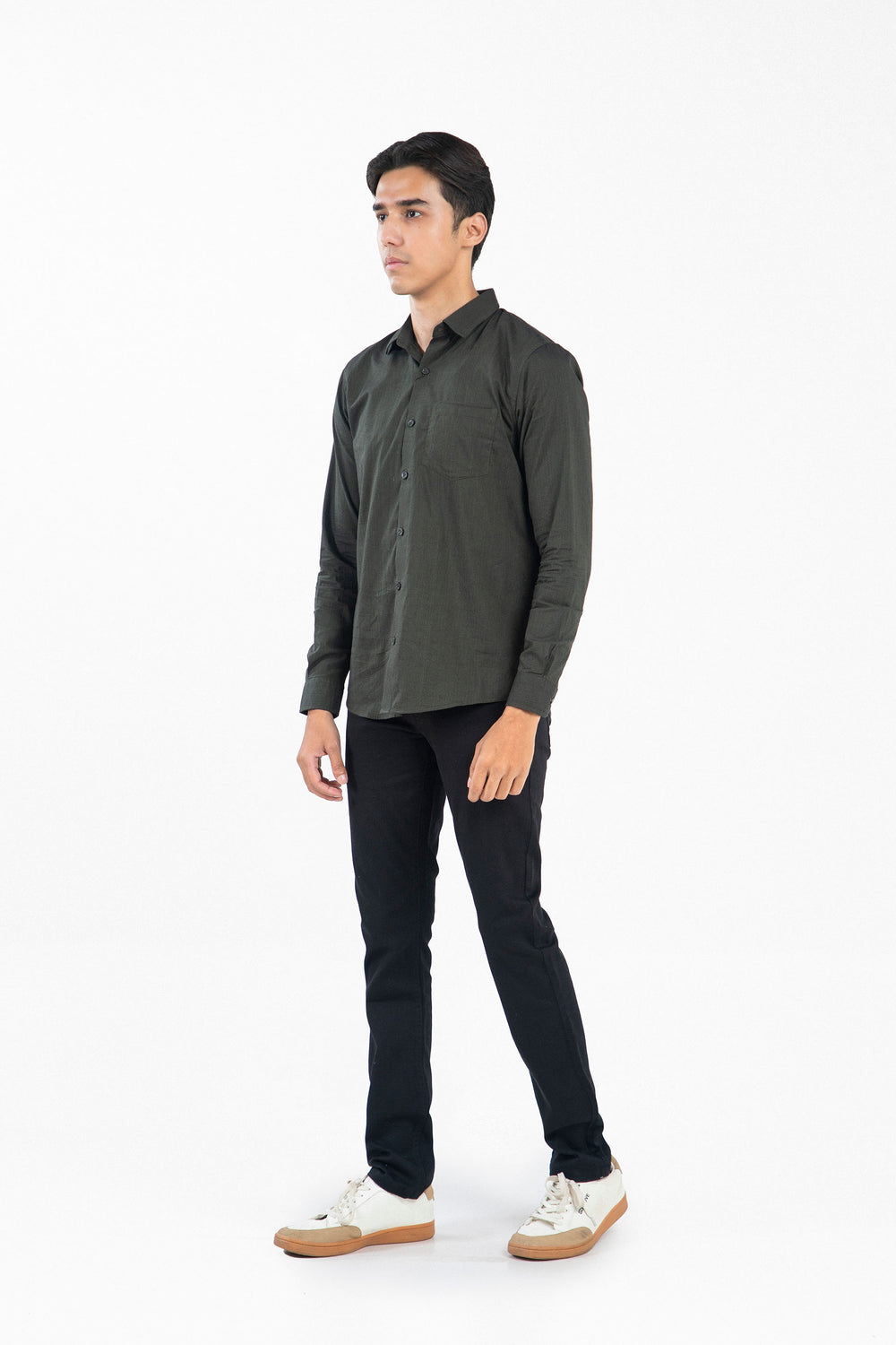 Slim fit shirt in textured fabrication, featuring collar with front buttoned placket and single pocket in front