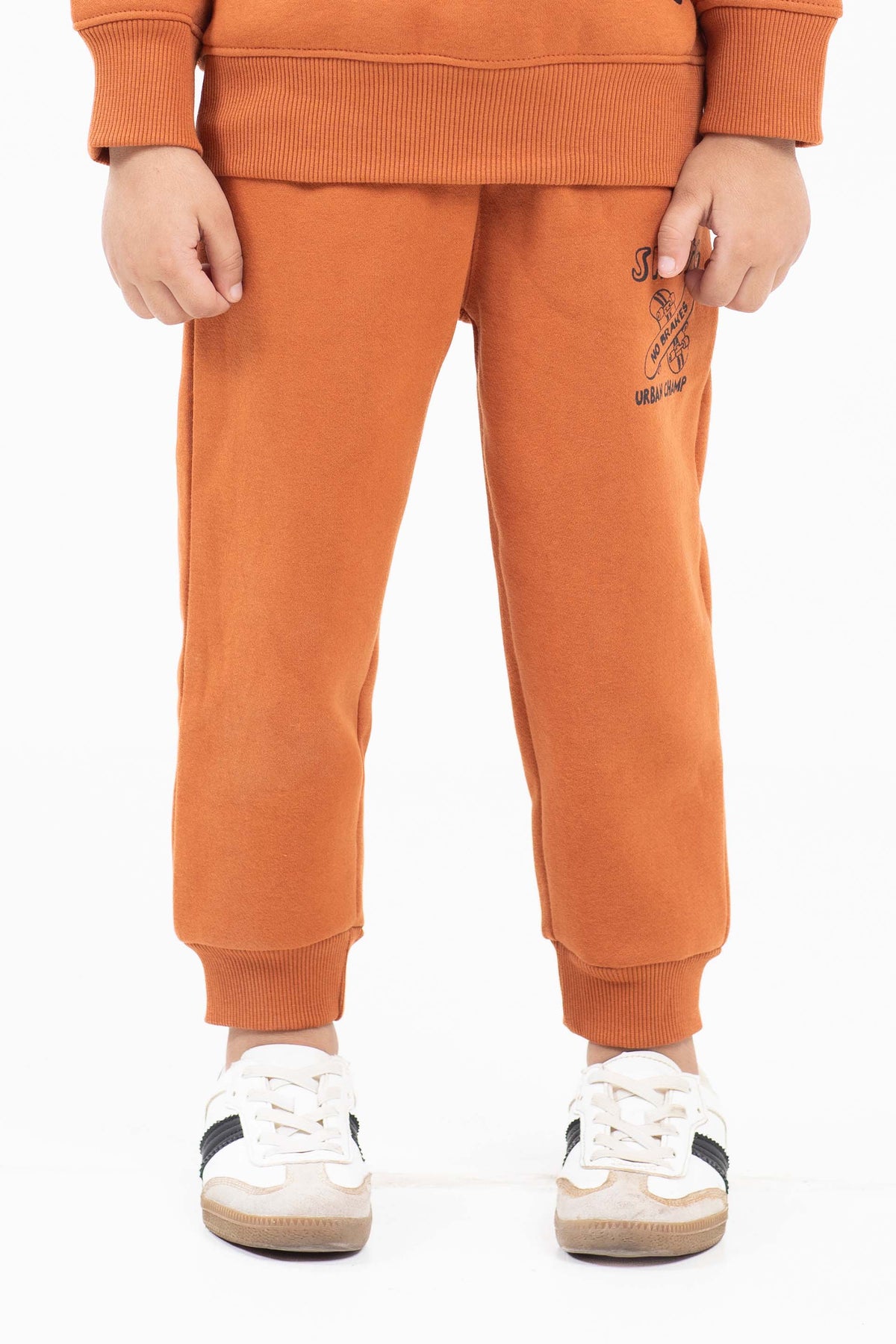 Jogger track pants in fleece fabrication, featuring elasticated waist belt with drawcord and print in front
