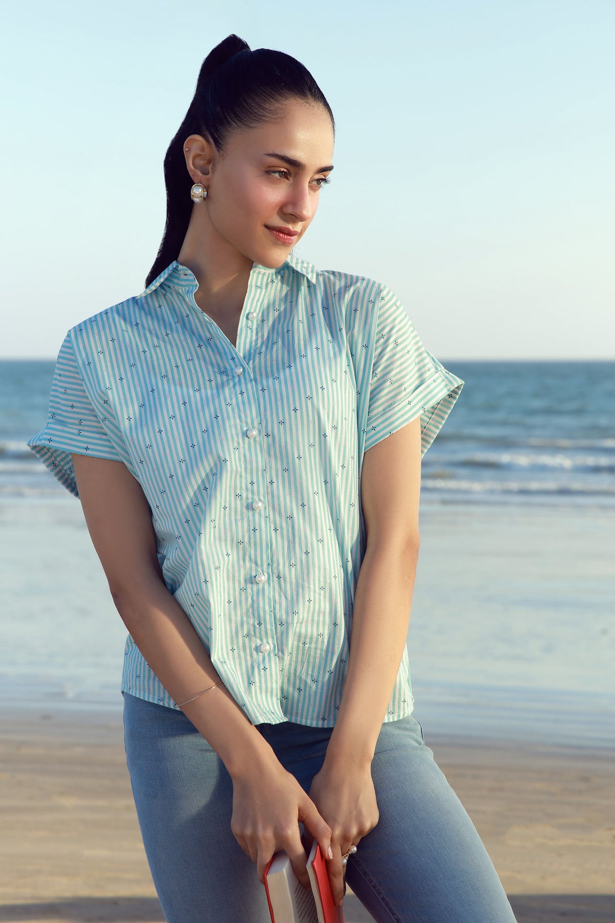 Drop shoulder shirt in silk blend fabrication, featuring embellished collar with front buttoned placket