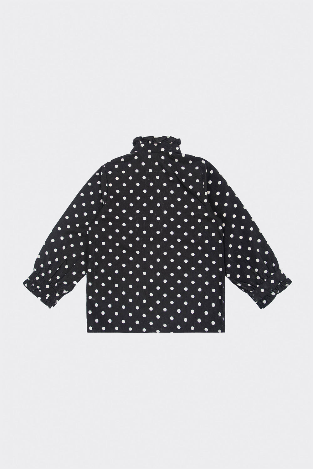 Button down shirt in cotton blend fabrication, short ruffle detailing around front placket and ban collar