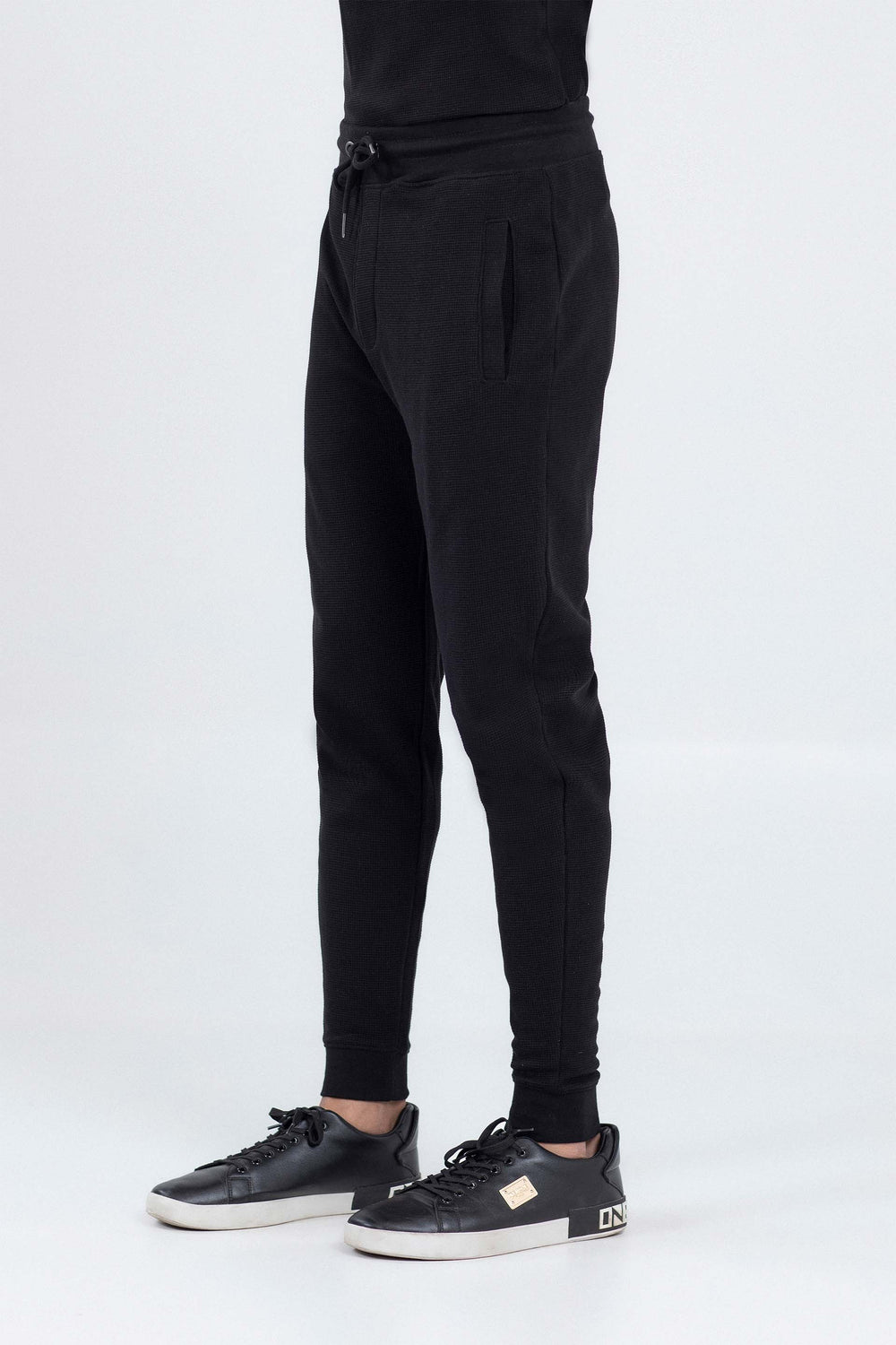 Track pants in waffle fabrication, featuring elasticated waist belt with drawcord, pockets and ribbed hem