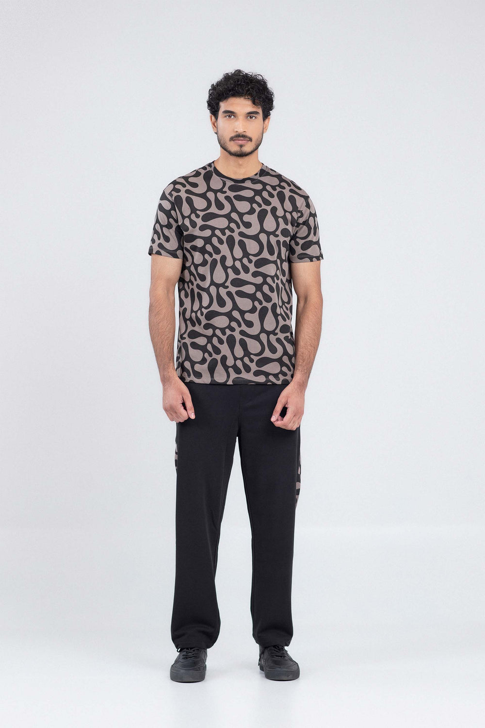 Comfort fit crew neck tee shirt in jersey fabrication, featuring an over all print
