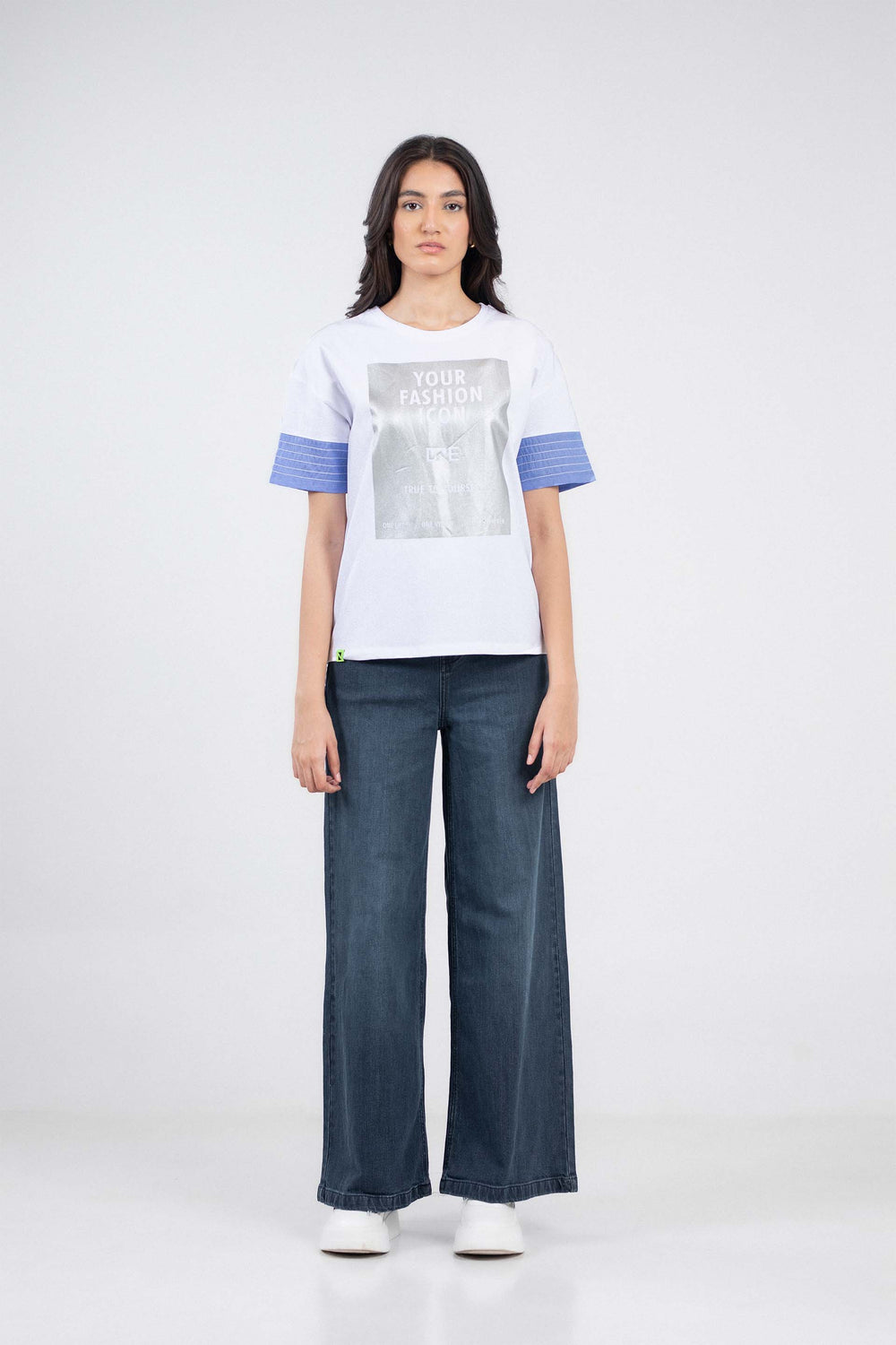 Drop shoulder regular fit tee shirt in jersey fabrication, featuring crew neck, foil print in front and contrasting chambray sleeve panesl with top stitch detailing