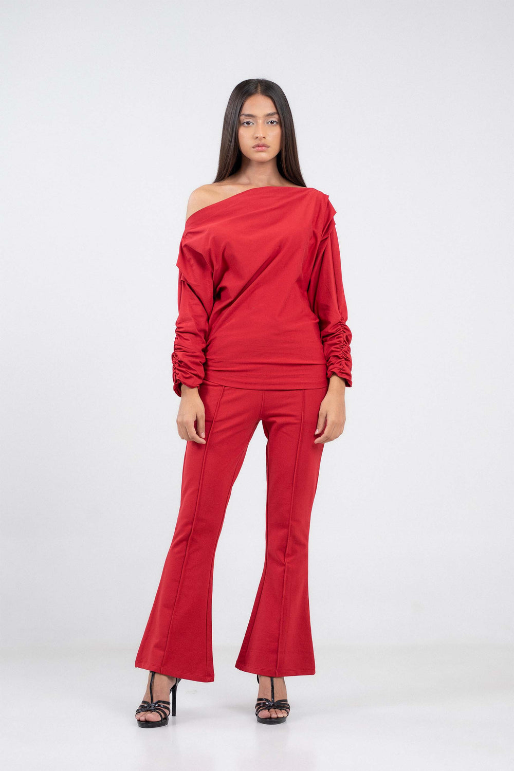 Jersey top, featuring an asymmetrical neck line with gathered sleeves