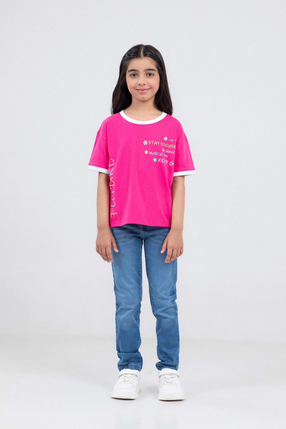 Drop shoulder crew neck tee shirt in jersey fabrication, featuring print in front with one side slit at hem