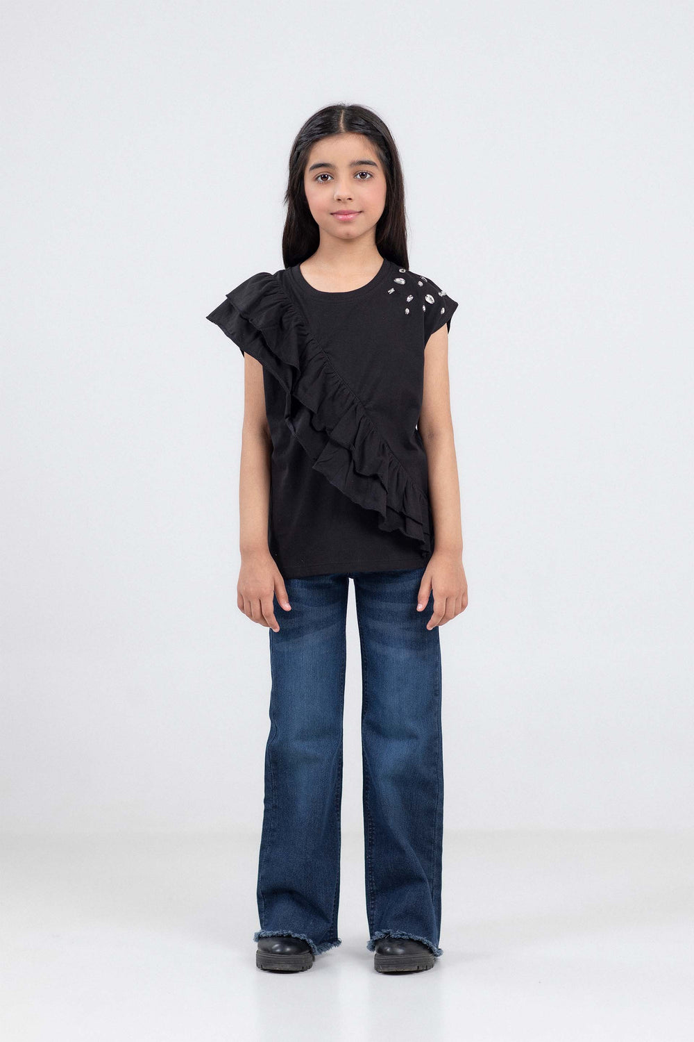 Crew neck tee shirt in jersey fabrication, featuring asymmetrical double ruffles in front and back with embellishment