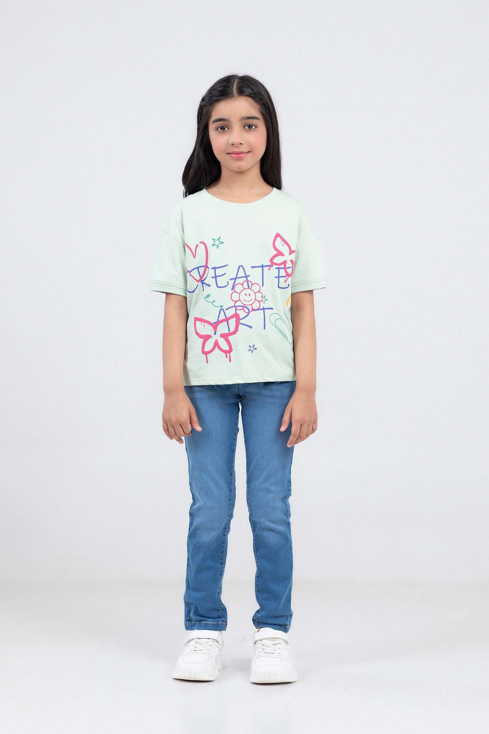 Drop shoulder crew neck tee shirt in jersey fabrication, featuring print in front