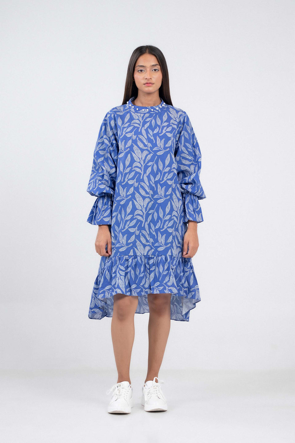 A-line flared dress in printed cotton blend fabrication, featuring frill detailing and faux pearl embellishment on collar
