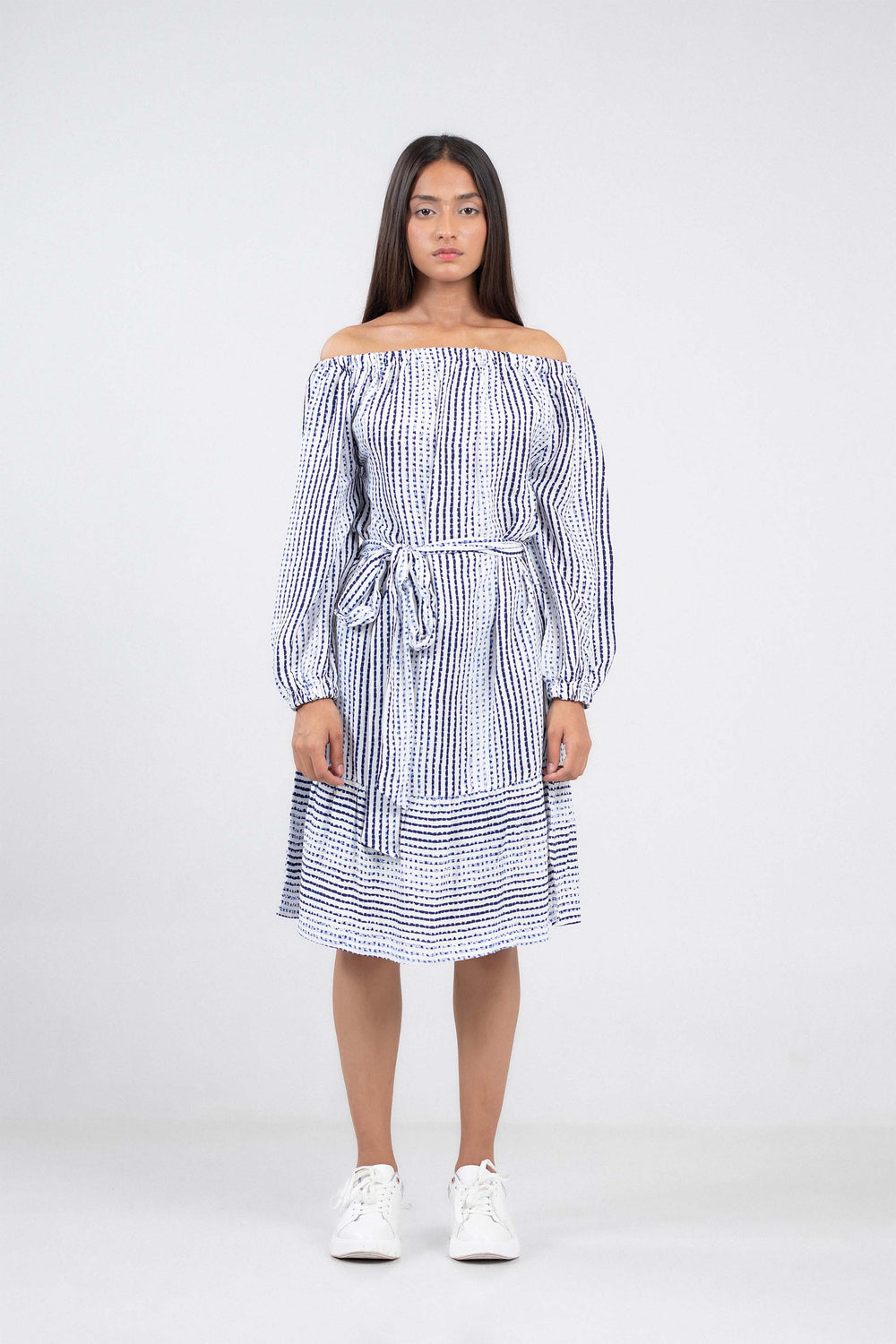Long cotton blend dress, featuring elasticated neckline and frill detailing at hem