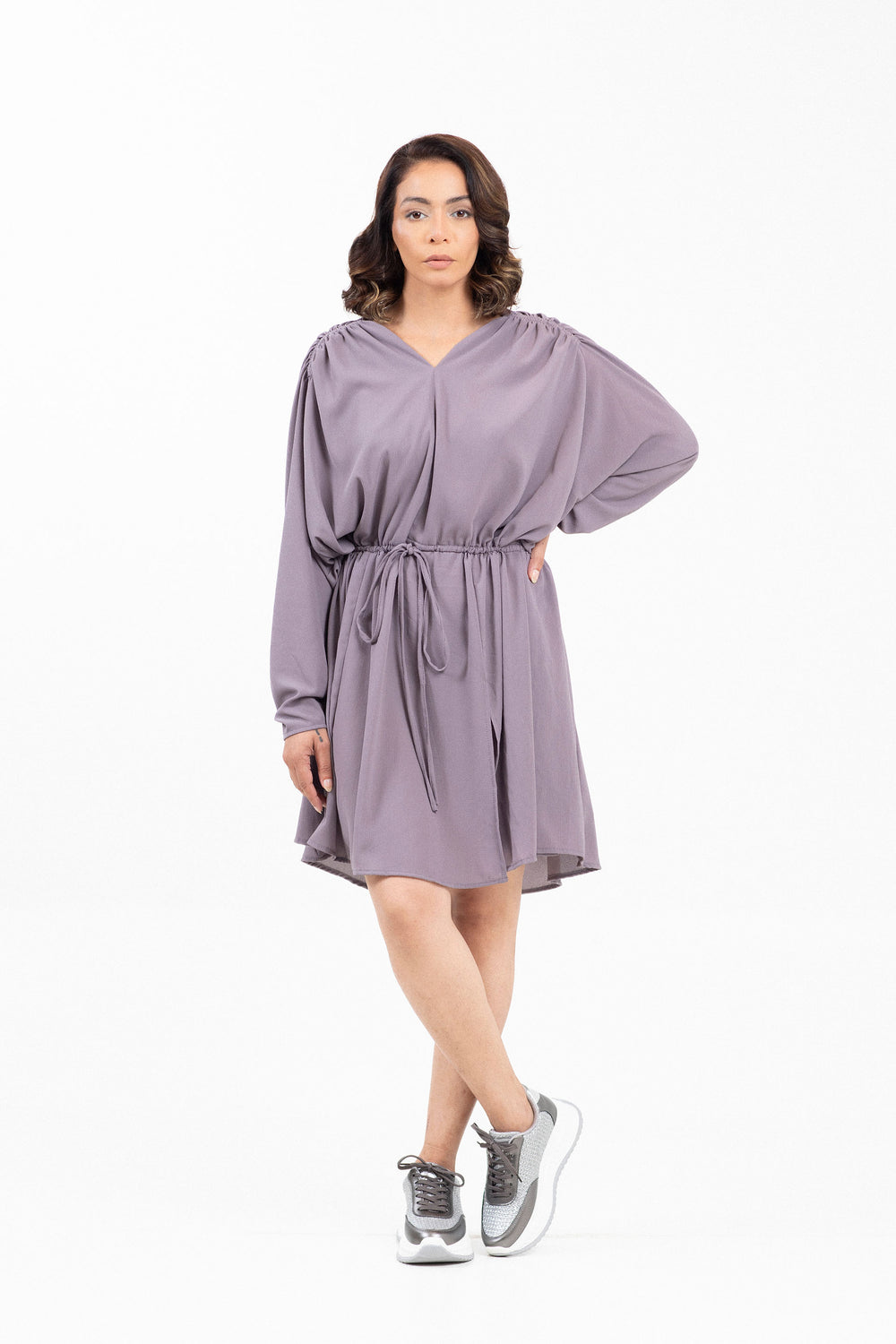 Mid length dress in georgette blend fabrication, featuring V neck, self fabric drawcord at waist and gathered detailing in front and back
